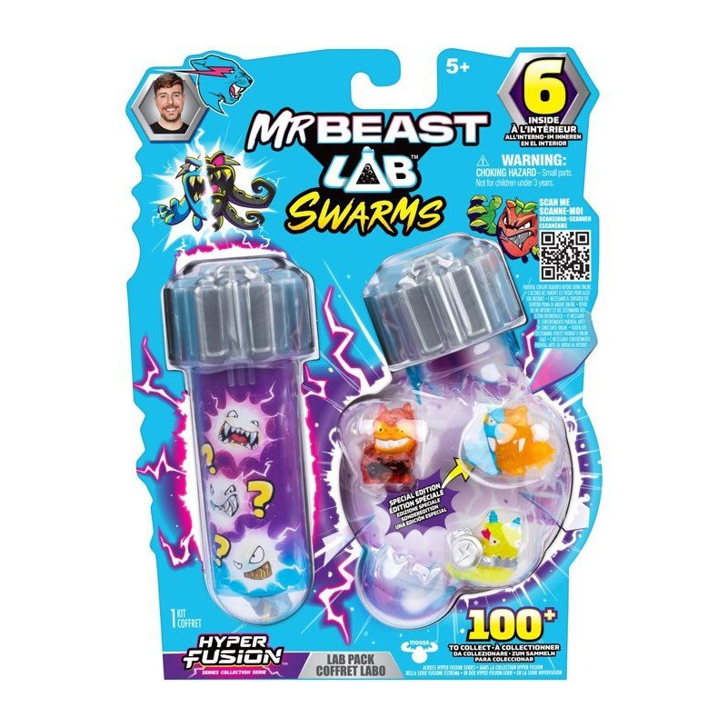Ouvre le tube a essai et surprise : 3 des 6 mini figurines MrBeast Lab Swarms Fusion de 2,5 cm apparaissent ! Plus de 100 a collectionner ! Utilise la capsule pour exposer et créer ton univers de Swarms !