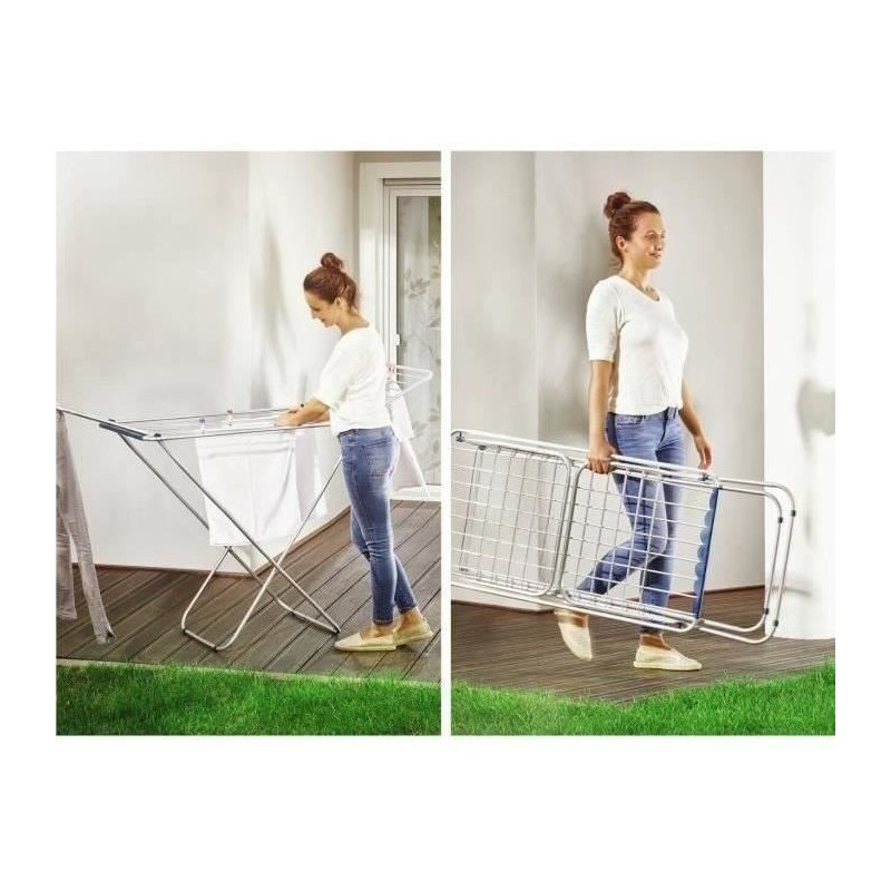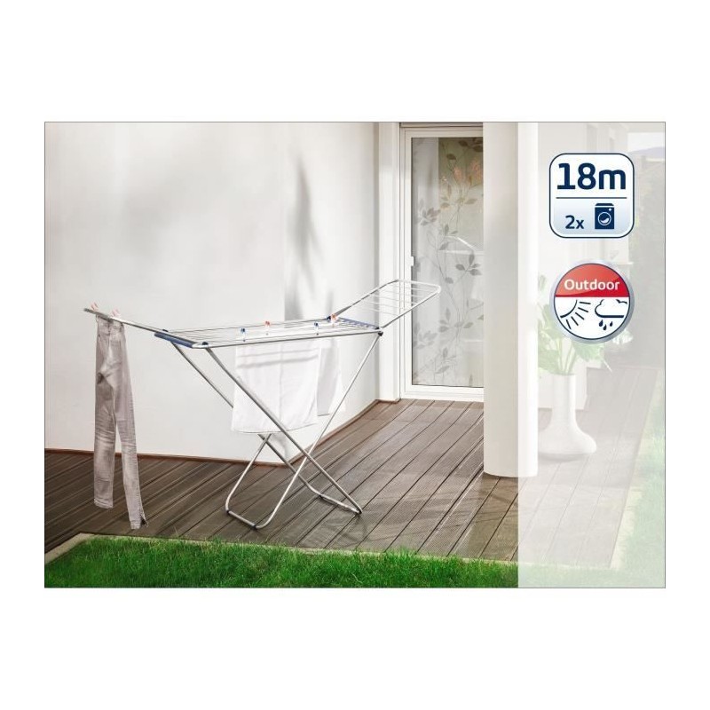 Le séchoir sur pieds Siena 180 ne pese que 2 kg et peut etre transporté sans efforts. En aluminium de qualité supérieur, il ne rouille pas et peut etre utilisé a l'intérieur comme a l'extérieur. Grâce aux 18 metres de longueur d'étendage, le Siena 180 peut accueillir le contenu de deux machines a laver. La hauteur des ailes de 112 cm est bien adaptée aux vetements longs également.