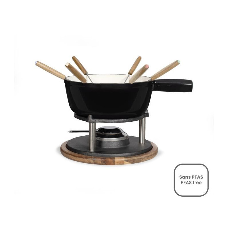 Optez pour le service a fondue tradition LIVOO MEN426N, parfait pour six personnes. Avec un caquelon en fonte émaillée et un socle en acacia, il assure des repas chaleureux. Livré avec six fourchettes en acacia.