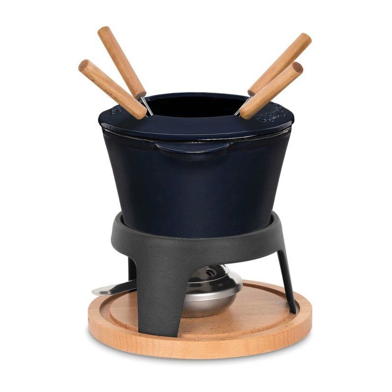 Partager des moments conviviaux autour du service a fondue 4 personnes MONT D'ARBOIS. Cet appareil a fondue en fonte élégant possede un socle en bois naturel, sur lequel est positionné la boite a alcool. La fonte assure une répartition homogene de la chaleur, tout au long de l'utilisation. MONT D'ARBOIS est doté d'une capacité de 1,2 L. Il est équipé d'un couvercle antiéclaboussures, avec un support pour vos fourchettes en bois de hetre. Son bol amovible en fonte émaillée est compatible au lave-vaisselle, facilitant ainsi le nettoyage. Le service a fondue MONT D'ARBOIS peut etre utilisé sur des plaques électriques, vitrocéramiques, inductions, gaz, au grill et au four. MONT D'ARBOIS vous accompagnera pour toutes vos fondues au fromage, a la viande, ou meme au chocolat !