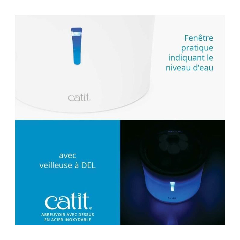 La fontaine a eau pour chat en acier inoxydable avec fleur Catit offre a votre chat une source continue d'eau propre et fraîche, favorisant son hydratation quotidienne. Son dessus peu profond en acier inoxydable garantit une hygiene optimale tout en préservant le confort de votre félin, évitant toute irritation des moustaches ou de la peau. Grâce a ses trois réglages de débit, cette fontaine s'adapte aux préférences de chaque chat, offrant un débit léger, une cascade de bulles ou un ruissellement apaisant. La fenetre avec veilleuse a LED intégrée permet de surveiller le niveau d'eau tout en guidant votre chat dans l'obscurité. Son design compact et ergonomique, doté d'un réservoir de 3 L, offre une capacité généreuse tout en occupant peu d'espace. Fabriqué en plastique sans BPA, il allie sécurité et durabilité. La fontaine est équipée d'un filtre a triple action qui purifie l'eau en continu, éliminant impuretés et odeurs pour une eau plus saine et plus attrayante pour votre chat. Elle est conçue pour fonctionner exclusivement avec les filtres a triple action Catit afin de garantir une performance optimale. Avant la premiere utilisation, il est recommandé de bien rincer le filtre et de le laisser tremper 10 minutes dans l'eau.