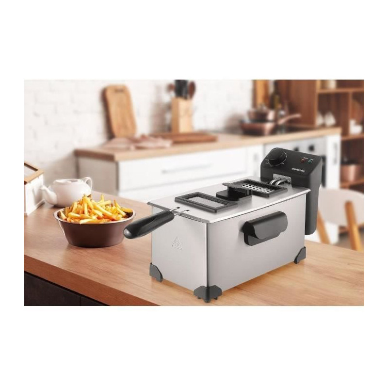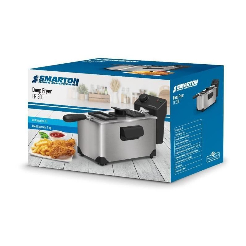 La friteuse Smarton FR 300 offre une capacité de 3 litres et permet de cuire jusqu'a 1 kg d'aliments. Son corps en acier inoxydable facilite le nettoyage. Avec un contrôle de température réglable de 90 a 190 °C et des témoins lumineux, elle garantit une cuisson parfaite et sécurisée.
