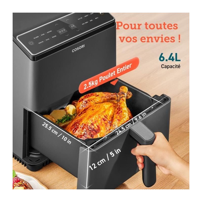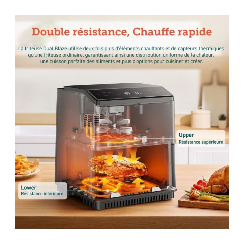Découvrez la friteuse sans huile COSORI Dual Blaze Chef Edition, avec une capacité de 6,4 L et 1700 W. Profitez de 12 programmes de cuisson pour des plats variés et savoureux. Sa technologie a double résistance assure une cuisson rapide et uniforme, tout en réduisant les matieres grasses de 85 %. Facile a nettoyer, elle est idéale pour les repas en famille.