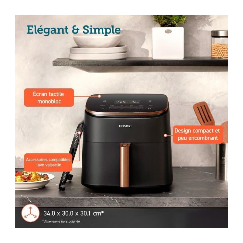 Découvrez la friteuse sans huile COSORI Turbo Blaze Chef Edition, alliant rapidité et efficacité. Avec 1725W, elle cuit jusqu'a 46% plus vite et réduit la consommation d'énergie de 40%. Sa capacité de 6L est idéale pour les familles, et ses 5 vitesses de ventilation permettent une cuisson personnalisée.
