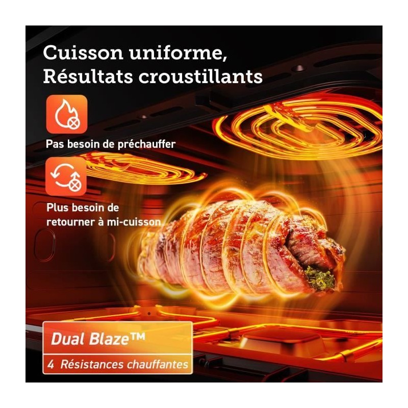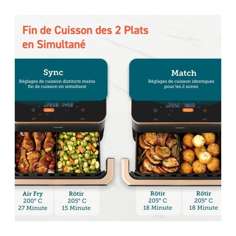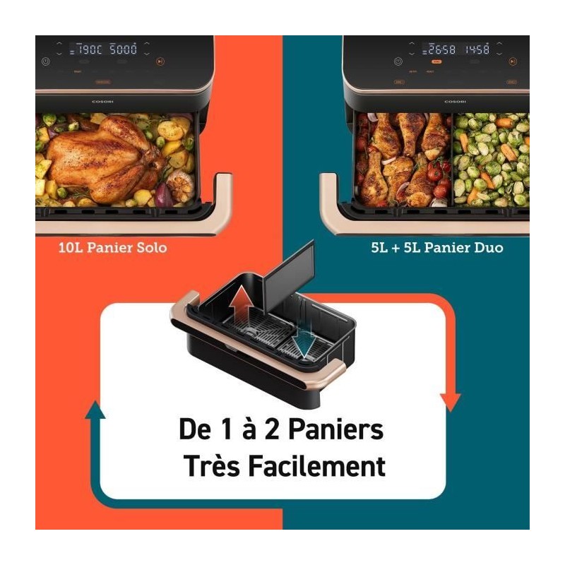 La COSORI Dual Blaze TwinFry est une friteuse sans huile puissante et polyvalente conçue pour transformer votre expérience culinaire. Avec une puissance de 2800W et une capacité exceptionnelle de 10 litres divisée en deux paniers indépendants de 5 litres chacun, cette friteuse offre une combinaison unique de puissance et de volume pour s'attaquer a toutes les situations culinaires. Voici ses principales caractéristiques : Puissance nominale de 2800W. Capacité de 10 litres divisée en deux paniers indépendants de 5 litres chacun. Plage de température de 35°C a 240°C. Minuterie allant de 1 minute a 48 heures. Polyvalence pour frire, cuire, rôtir, griller et bien plus encore. Interface intuitive et écran tactile complet pour une utilisation facile. Poignée et base améliorées pour plus de maniabilité et de sécurité. Distribution uniforme de la chaleur grâce aux éléments chauffants supérieurs et inférieurs. Technologie Dual Blaze pour des aliments croustillants et savoureux sans préchauffage. Pince en silicone et plateau amovible "GRANDZONE" inclus pour faciliter la cuisson et la manipulation des aliments. Acces a une large sélection de recettes en ligne pour inspirer votre créativité culinaire. En résumé, la friteuse Dual Blaze TwinFry de COSORI allie puissance, volume, polyvalence et praticité pour vous offrir une expérience culinaire exceptionnelle a domicile.