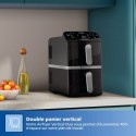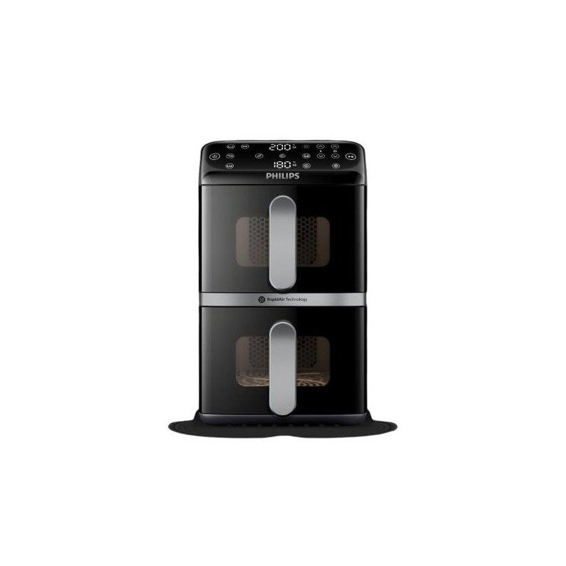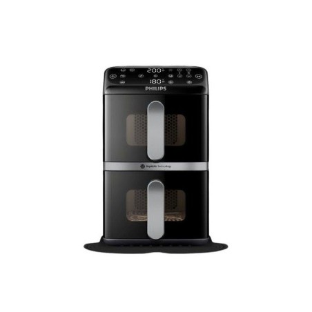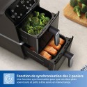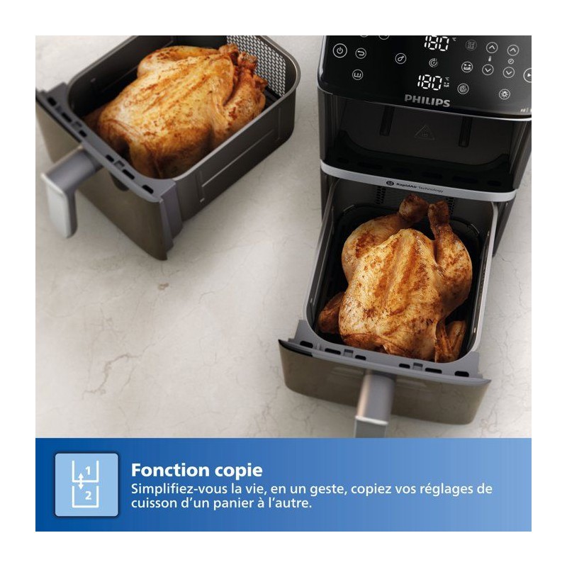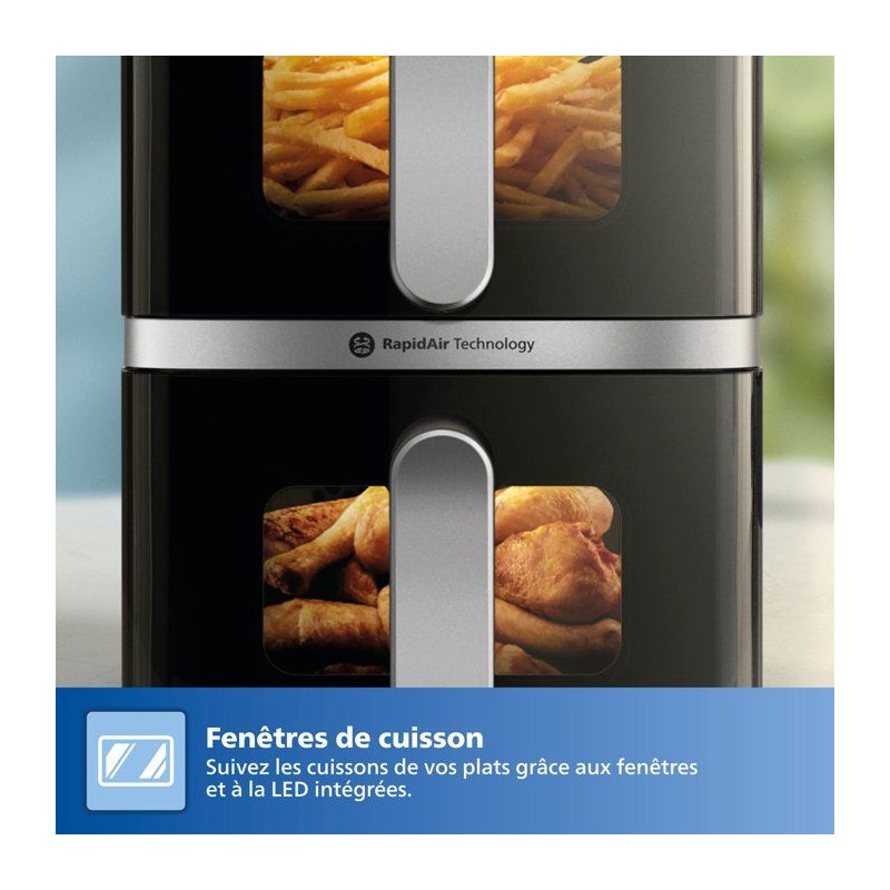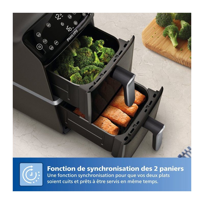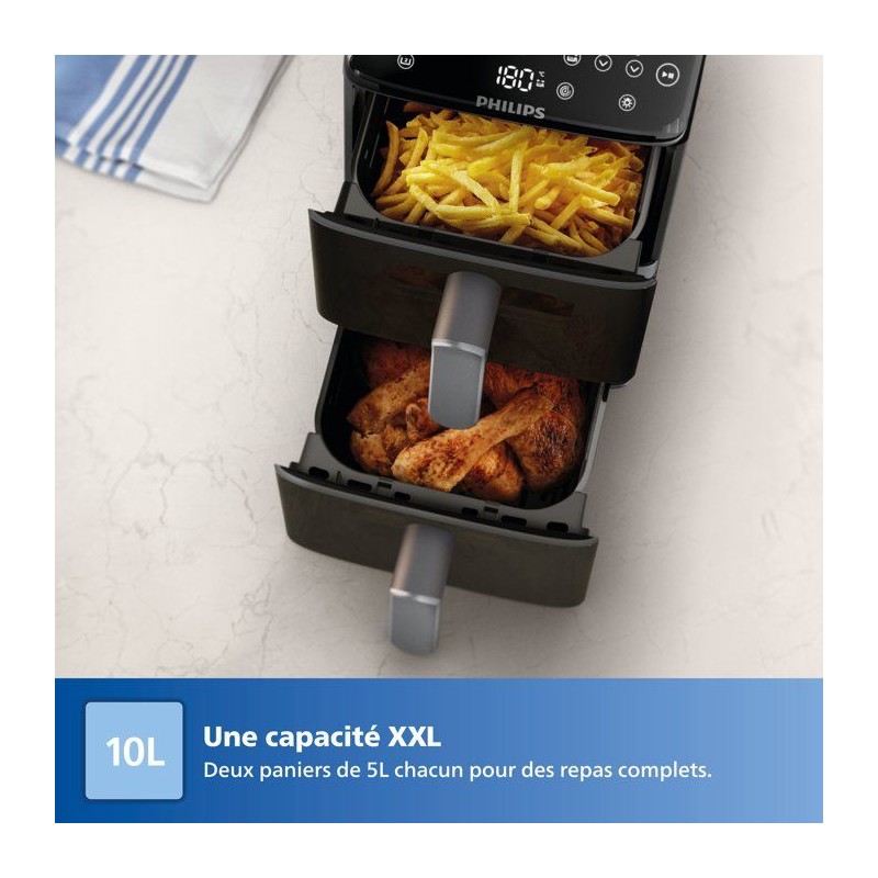 Avec l'Airfryer Philips Vertical Duo, gagnez de l'espace en cuisine tout en préparant des repas généreux. Cuisinez en toute simplicité avec les deux paniers de 5 L, chacun équipé d'une fenetre pour garder un oeil sur la cuisson de vos plats préférés. Les paniers de l'Airfryer Philips Vertical Duo ont une capacité de 5 L chacun, parfaits pour cuisiner un repas complet et sain pour toute la famille. Chaque panier est équipé d'une fenetre intégrée pour suivre la cuisson de vos plats sans ouvrir les paniers. Avec l'Air fryer Philips Vertical Duo, vous n'aurez plus a vous soucier des temps de cuisson. L'appareil dispose d'une fonction de synchronisation des cuissons pour que tous vos aliments soient prets a etre servis en meme temps. Et grâce a la fonction maintien au chaud, vous pouvez garder votre repas pret jusqu'au moment de le servir. L'écran tactile de cette friteuse a air chaud propose 6 préréglages et 13 modes de cuisson pour une cuisine simple et rapide. La fonction copie vous permet de dupliquer des réglages de cuisson d'un panier a l'autre, pour vous simplifier les réglages en cuisine et gagner du temps. Préparez des plats délicieux sans culpabilité avec cette friteuse sans huile ! Avec jusqu'a 90 % de matieres grasses en moins, vos repas sont sains et savoureux, le tout avec tres peu d'huile. Doux pour votre porte-monnaie, cette friteuse sans huile consomme jusqu'a 70 % d'énergie en moins par rapport a un four standard, tout en offrant des performances exceptionnelles. Conçue avec des pieds antidérapants pour éviter les accidents. Ses poignées et parois restent froides au toucher, éliminant ainsi tout risque de brûlure. Bénéficiez de recettes personnalisées grâce a l'application HomeID. Suivez les instructions étape par étape et découvrez des centaines de plats sains, tous adaptés a votre air fryer Philips Vertical Duo. Un nouveau revetement en céramique, sans PFAS, toujours compatible lave-vaisselle, pour un entretien et un nettoyage plus faciles.