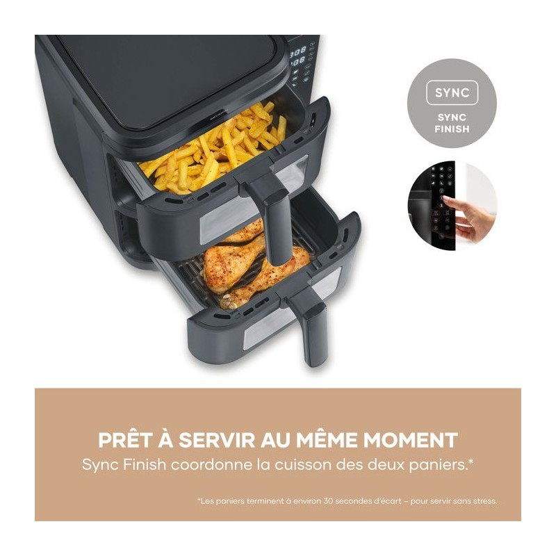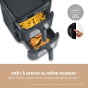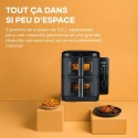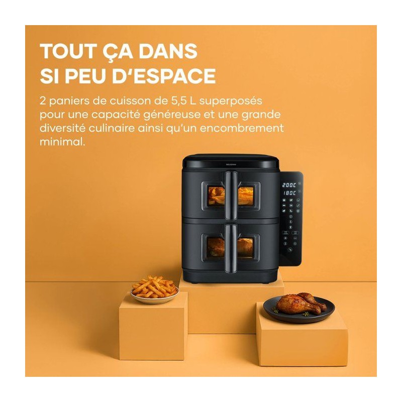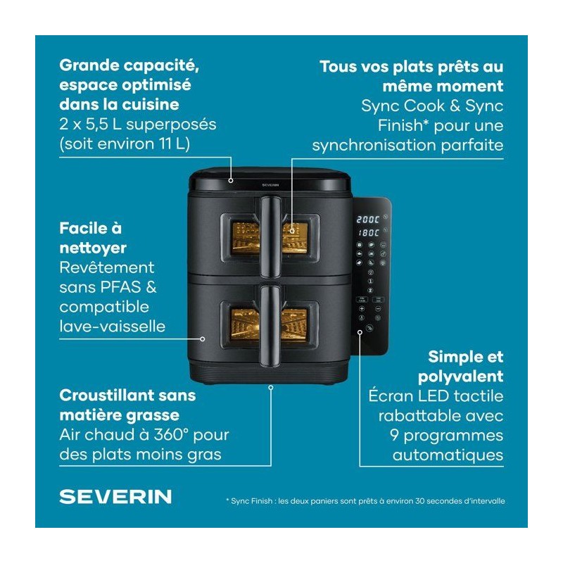 La friteuse a air SEVERIN FR9598 propose un design vertical Duo Stack avec deux cuves 5.5 L indépendantes. Technologie air chaud 360°, 9 programmes automatiques, fonctions Sync Cook et Sync Finish. Éclairage intérieur, pieces sans PFAS compatibles lave-vaisselle. Cuisson saine et rapide pour toute la famille.
