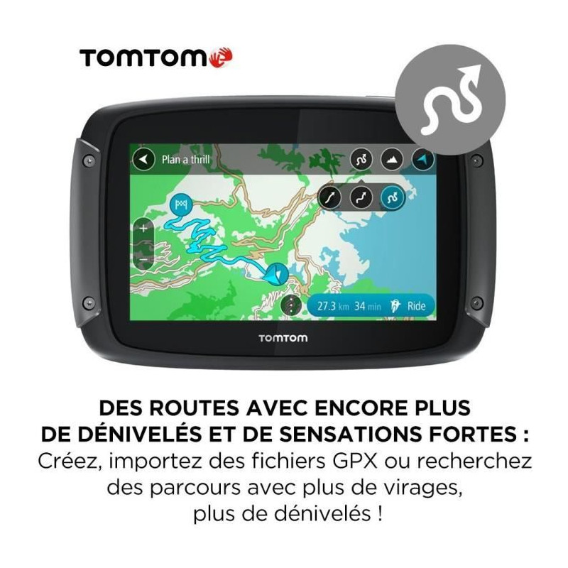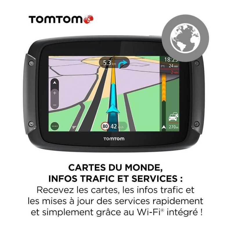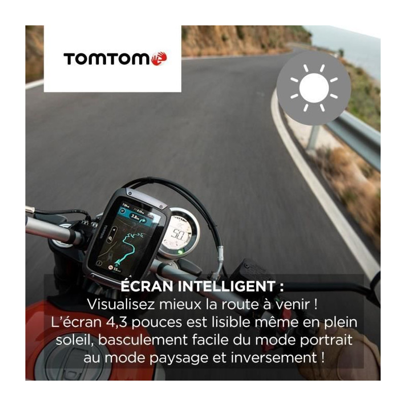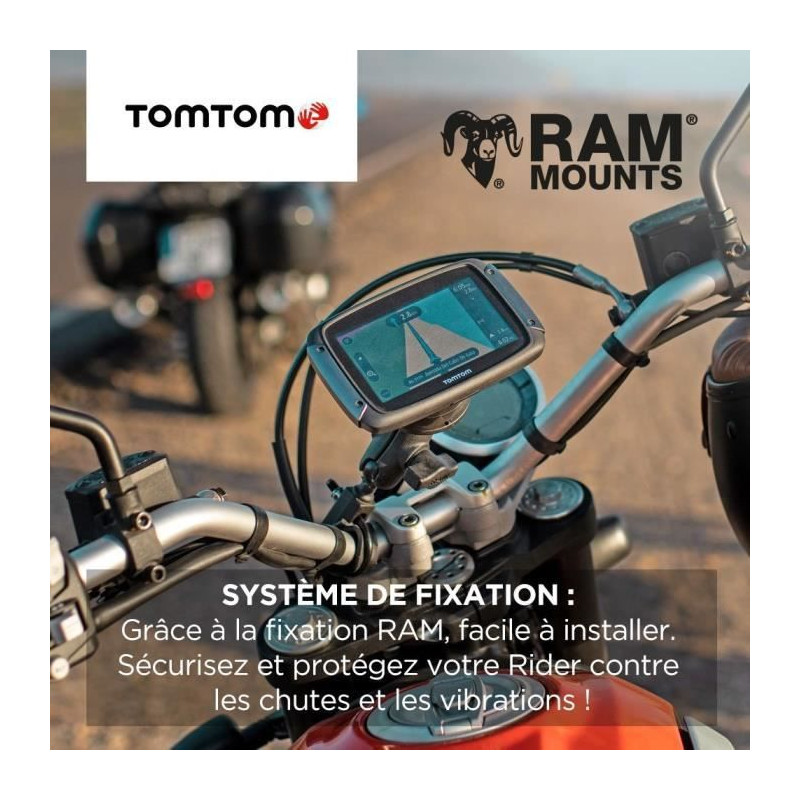 Le navigateur GPS Moto TOMTOM Rider 550 Prémium est équipé d'un écran tactile adapté aux gants et d'une fixation antivol avec clé et housse de protection. Il inclut plus de 200 parcours dans le monde et permet l'installation et les mises a jour des cartes du monde. Il est également possible de recevoir les notifications des zones de danger.