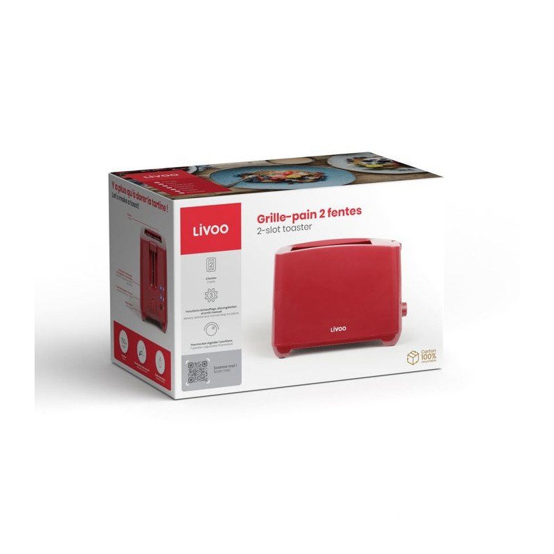 Grille-pain 2 fentes - LIVOO - DOD162RC - 750 W - Thermostat réglable : 7 niveaux - Rouge