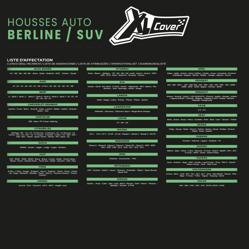 Housses auto - XLCOVER - SUV/Berline - Fractionnable - Housses assises/dossiers avant, appuis-tete et banquette arriere