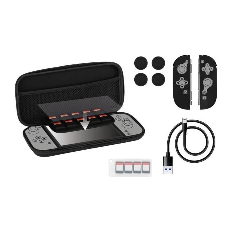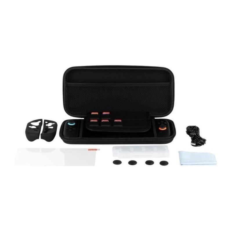 Ce starter kit complet comprend tout le nécessaire pour profiter pleinement de votre console : housse de transport robuste et élégante, verre trempé facile a poser pour protéger l'écran contre rayures et chocs, appuis-pouces en silicone ergonomiques pour améliorer confort et précision, étui pour 9 jeux, chiffon de nettoyage et câble USB. Tous les accessoires sont compatibles avec la Switch 2, la Switch classique et la Switch OLED, offrant une polyvalence totale pour accompagner votre console partout.