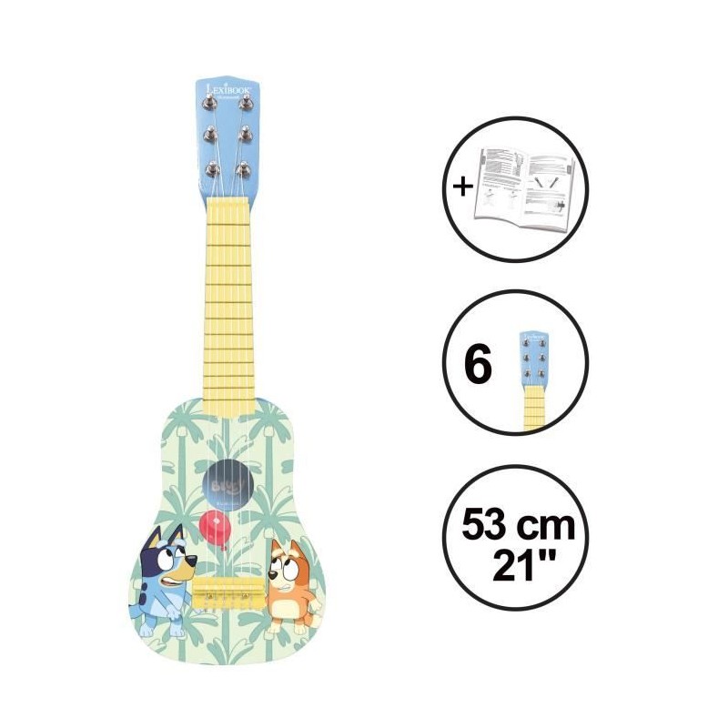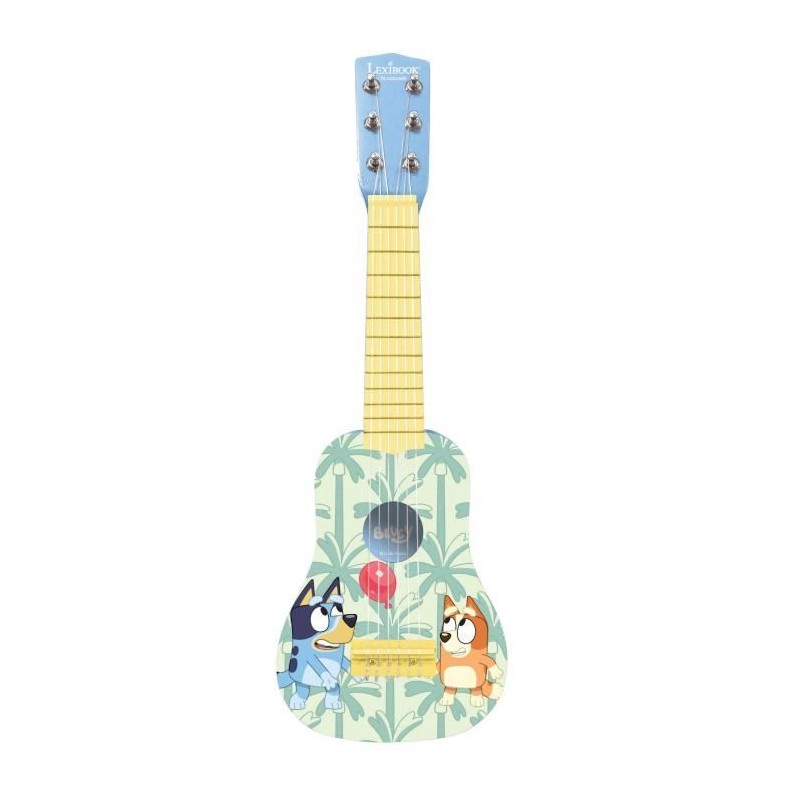 Cette petite guitare est idéale pour accompagner les guitaristes en herbe dans leurs premiers pas en musique, en bois pour une excellente qualité sonore, possibilité d'accorder la guitare (accordeur non inclus), bonus : comprend un petit guide pour apprendre a jouer de la guitare, joli design avec Bluey