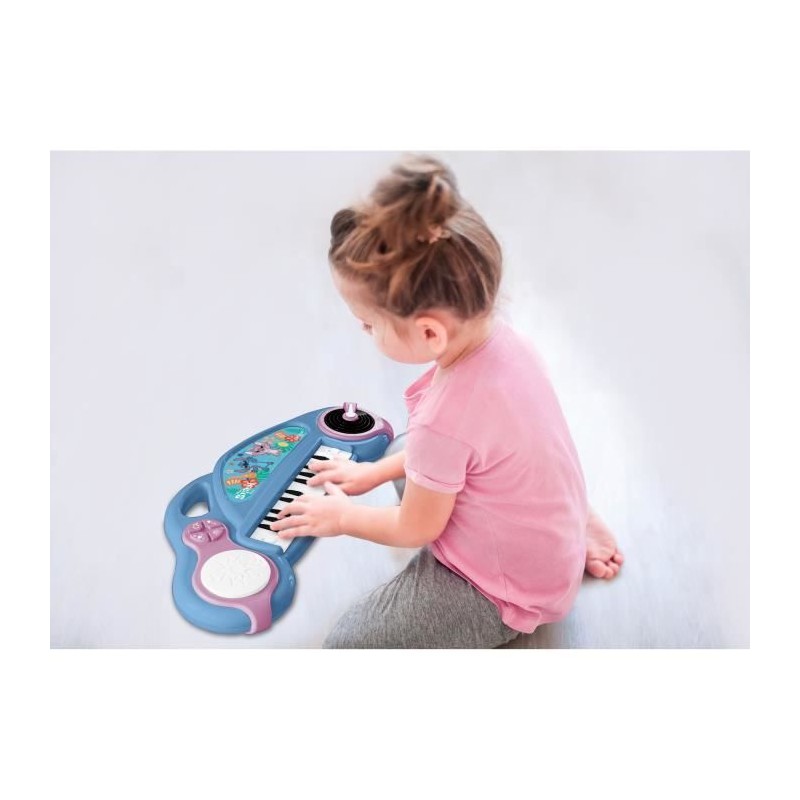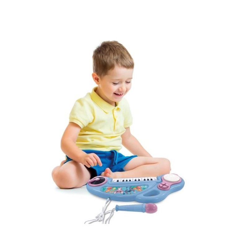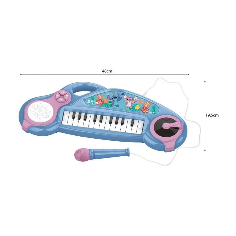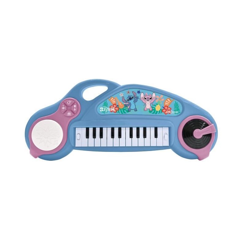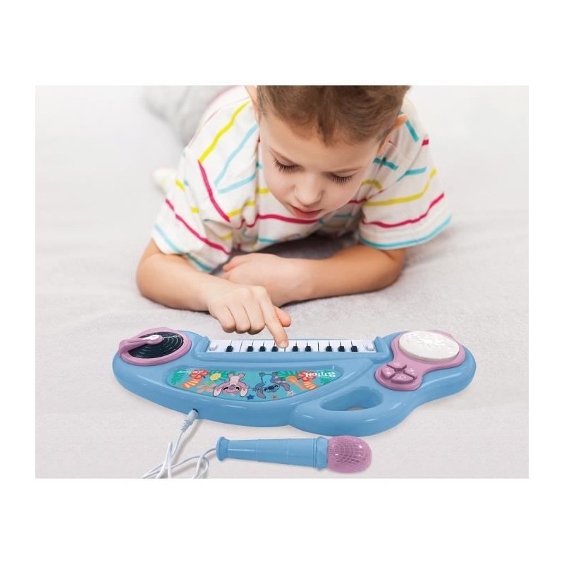 Joue du piano et chante grâce au clavier électronique avec microphone Stitch ! 4 types d'effets sonores : piano, guitare, violon, saxophone. 22 mélodies de démonstrations. Comme un vrai DJ, amuse-toi a changer les mélodies a l'aide du bouton batterie et de la platine. Microphone inclus. Volume réglable