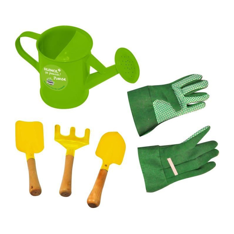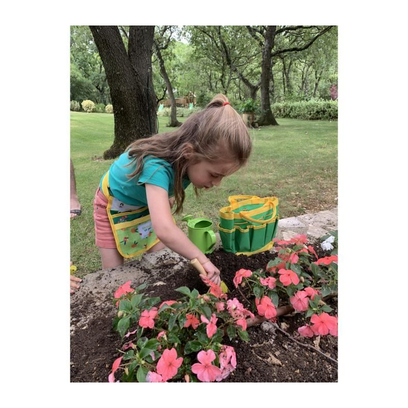 DÉCOUVRE LE JARDINAGE : Notre sac de jardinage 6 pieces est idéal pour inculper la passion de la nature aux plus jeunes. Il encourage les enfants a prendre soin de l'environnement et a développer un respect pour la nature. a partir de 3 ans, nos produits sont adaptés a la taille des mains des enfants. C'est parti, les enfants prennent le contrôle du jardin ! LE CONTENU: Ce kit comprend : 1 sac de jardinier en tissu, 2 pelles en métals, 1 rateau en bois et métal, 1 arrosoir en métal et des gants de jardinage. Facile a utiliser, il offrira des heures d'amusement a tous les jardiniers en herbe pour planter, cultiver, entretenir, pour explorer ou découvrir la nature. Notre kit est fabriqué avec des matériaux de qualité supérieure ici du métal pour assurer une durabilité maximale. POUR JOUER DEHORS : Grâce a ce kit éducatif et amusant, vos enfants prendront du plaisir dans une activité exterieur, dans un jardin, sur une terrasse ou sur un balcon. Ils apprendront les bases de la botanique tout en passant du temps a l'extérieur et en créant quelque chose de leurs propres mains UN CADEAU IDÉAL : Pour un anniversaire, une fete, les vacances ou tout autre occasion, offrez une expérience écologique, amusante et conviviale. Planter, arroser, semer, sentir et toucher sont autant de gestes que vos enfants pourront apprendre pour éveiller leurs sens sans utilisation d'écran TOUJOURS PLUS D'AMUSEMENT?! : Planete Plante invite les enfants a découvrir les joies du jardinage tout en s'amusant. Avec leur panoplie de petit jardinier - gants, mini tabliers, chapeaux et outils adaptés - ils développent leur patience, leur curiosité et leur connexion a la nature