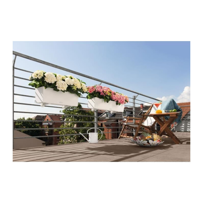 L'été sur votre balcon ! Meme lors de fortes chaleurs, les pots BALCONERA prennent soin de vos plantes et leur apportent l'humidité suffisante grâce au réservoir d'eau de 3 ou 5 litres. Pour utilisation a l'extérieur, avec vis de trop plein. Bac d'arrosage de couleur neutre interchangeable - ouvert, avec poignées abaissables. S'utilise suspendu ou posé. NOUVEAU : Rehausse pour Balconera en option. Accessoire : Accroches-balconnieres LECHUZA : convient pour les BALCONERA 50 et 80, s'adapte au montage sur des rambardes jusqu'a 38 cm de largeur, ainsi qu'au mur. LECHUZA Complément aux accroche-balconnieres : Extensions modulables pour garde-corps. Ajustement sûr et parfait pour tous les garde-corps. S'adaptent aux BALCONERA 50 et 80. Disponibles en noir et blanc. Notre conseil : Si votre rambarde fait plus de 38 cm de largeur, vous pouvez acheter un set supplémentaire de fixations plus grandes pour balconnieres. Conseil: Par temps d'orage, votre bac d'arrosage s'enleve facilement afin de mettre vos plantes a l'abri, sans toutefois démonter BALCONERA entierement !
