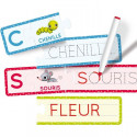 Cette boite va faire découvrir les premiers mots aux enfants. Associe chaque lettre avec l'animal qui commence par cette lettre et ajoute enfin la derniere partie pour suivre les pointillés et apprendre a écrire les mots et découvrir les lettres. Les 72 cartes sont effaçables a sec. feutre effaçable livré. Des 3 ans.