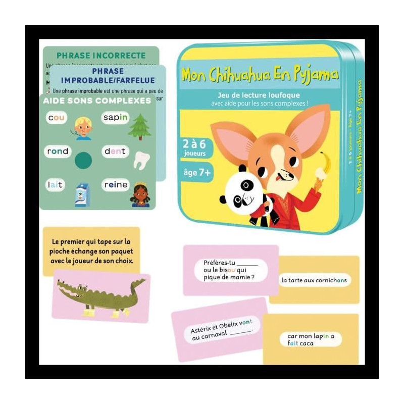 Découvrez Mon Chihuahua en Pyjama, un jeu de cartes amusant pour toute la famille. Formez des phrases loufoques avec 100 cartes recto/verso et 8 cartes d'aide. Idéal pour les enfants a partir de 4 ans, ce jeu se joue en intérieur et nécessite la présence d'un adulte. Parfait pour 3 joueurs ou plus !