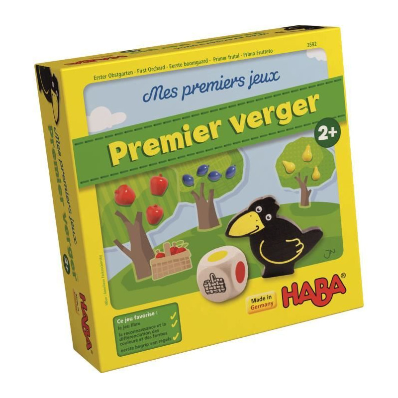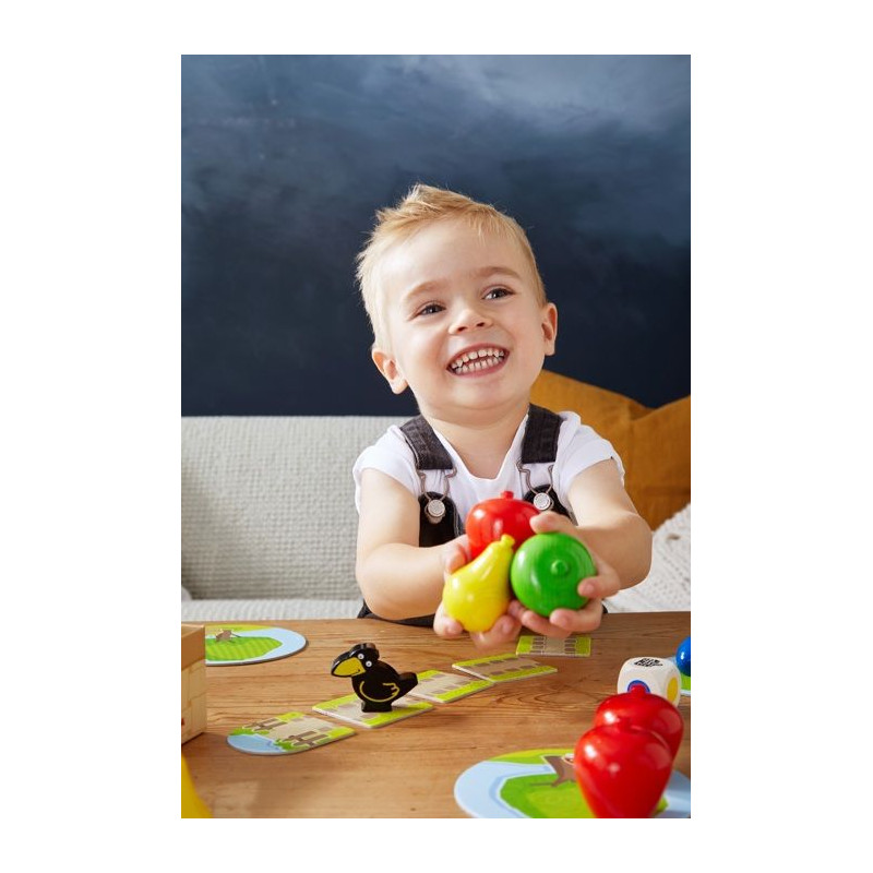 Le jeu classique du Verger revisité pour les tout-petits : la regle est adaptée a l'âge des enfants et les accessoires sont spécialement conçus pour leurs petites mains. Les jolies pieces en bois faciles a saisir invitent également a jouer selon son imagination et stimulent la motricité.