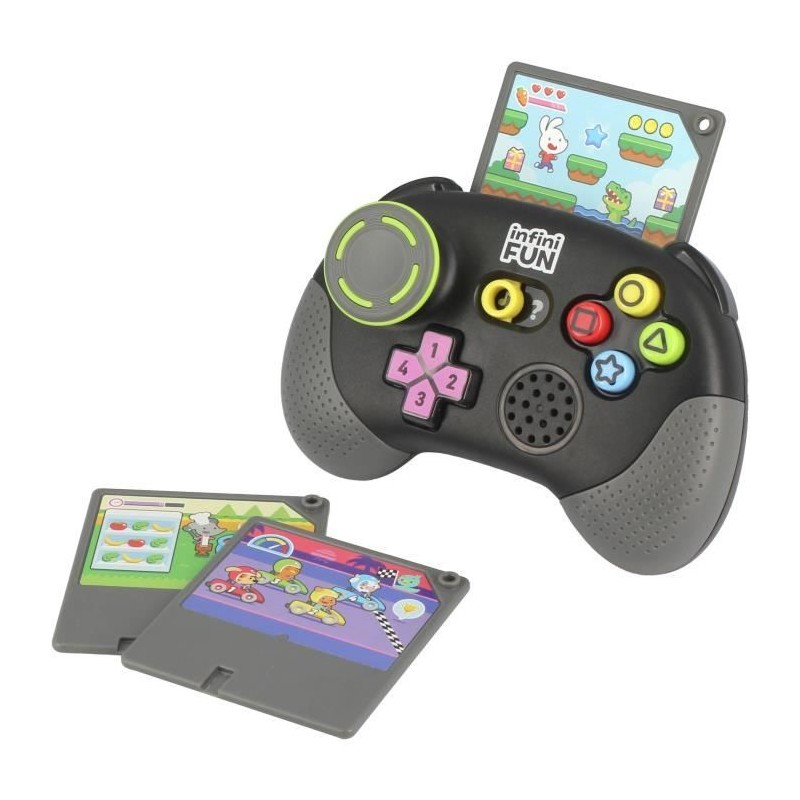 Les enfants ont désormais leur propre manette de jeu avec 2 modes : Découverte et Quiz. En appuyant sur les formes, la fleche directionnelle ou le joystick, ils activent différents contenus. En insérant une cartouche, ils découvrent les couleurs, formes, chiffres, animaux et véhicules. Les effets sonores réalistes ajoutent une touche amusante, assurant des heures de jeu et d'apprentissage interactif !