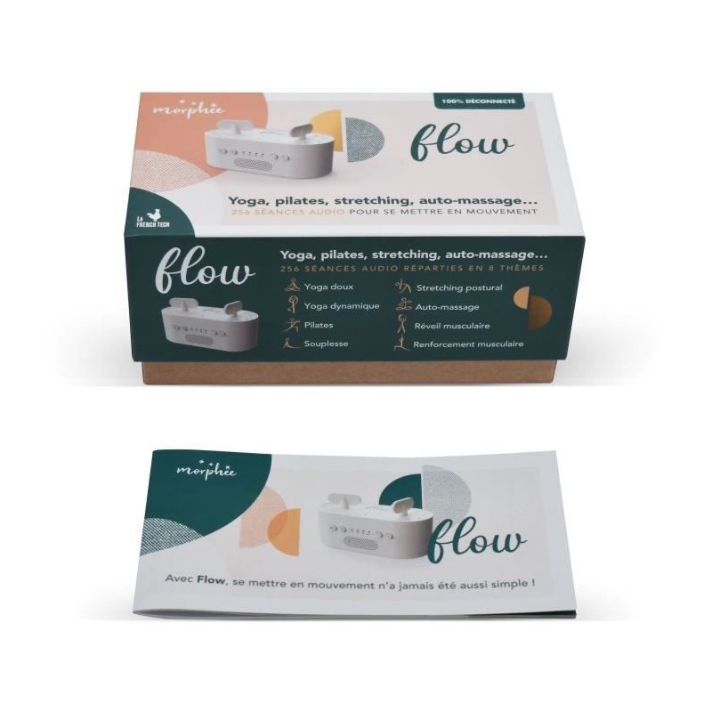 Avec la Box Flow de MORPHEE, bougez a votre rythme grâce a 256 séances audio de yoga, pilates, stretching, réveil musculaire et auto-massage. Conçue par une équipe d'experts, elle vous guide dans des pratiques adaptées a tous les niveaux, sans écran ni distraction. Choisissez la durée qui vous convient (10, 15, 30 ou 40 minutes) et laissez-vous porter par des voix apaisantes, masculines ou féminines. Flow est une invitation a se reconnecter a son corps, où que vous soyez. Son enceinte intégrée permet une utilisation simple et immédiate, sans besoin de connexion. Idéale pour instaurer une routine bien-etre, Flow vous accompagne dans votre épanouissement physique et mental, en toute liberté.