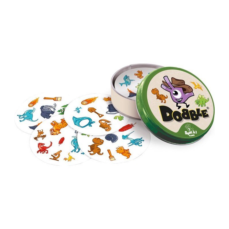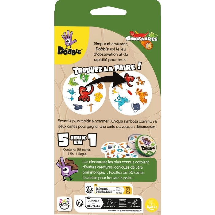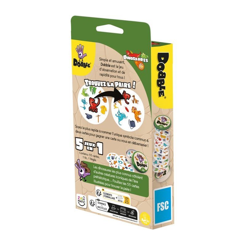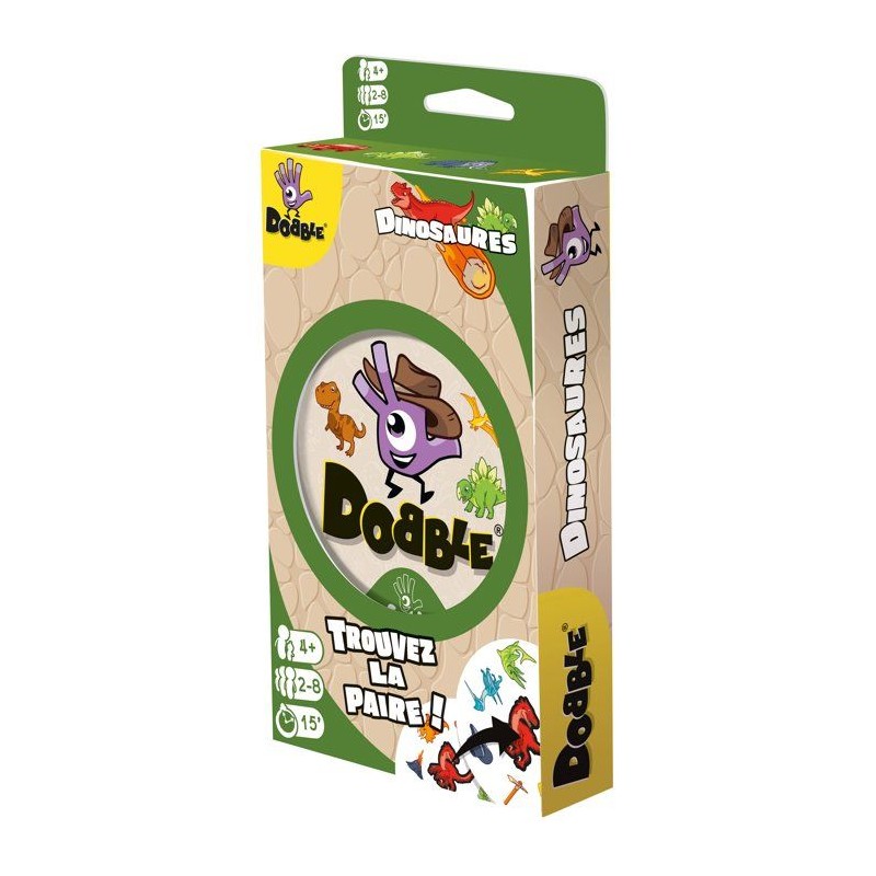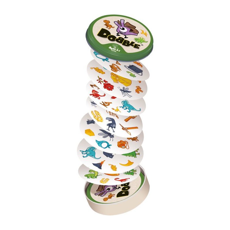 Votre jeu d'observation et de réflexes préféré revient dans une édition Dinosaures. Plongez dans l'ere jurassique et rugissez de victoire en repérant le seul symbole identique entre deux cartes. Tricératops, ptérodactyles et tyrannosaures vous attendent pour de féroces parties, des xx ans.