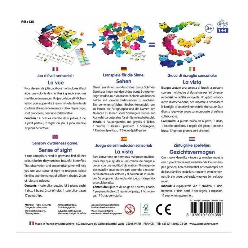 Un jeu collaboratif où il faut reconstituer au plus vite les chenilles avec leurs multiples nuances de couleurs, avant qu'elles ne se transforment en papillons. Un jeu d'observation et de réflexe pour apprendre tres facilement le nom de toutes les couleurs. Peut se jouer seul, avec le systeme d'autocorrection préconisé dans la méthode Montessori, ou a plusieurs.
