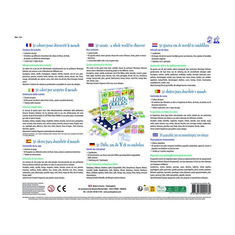 Un jeu idéal pour découvrir les bruits de la ville, des animaux, des instruments de musique ou le chant des oiseaux. Il se joue avec 50 sons pour les plus petits et 70 pour toute la famille. Des qu'un joueur appuie sur le bouton, un son est émis et il s'agit de retrouver au plus vite sa représentation visuelle parmi les 50 ou 70 jetons. Il permet, en outre, de développer la connaissance des lan_x0002_gues, car les réponses sont traduites en anglais, espagnol, allemand, hollandais, portugais, italien et russe. Nécessite 2 piles (non incluses) : AAA (1,5 V - LR03)