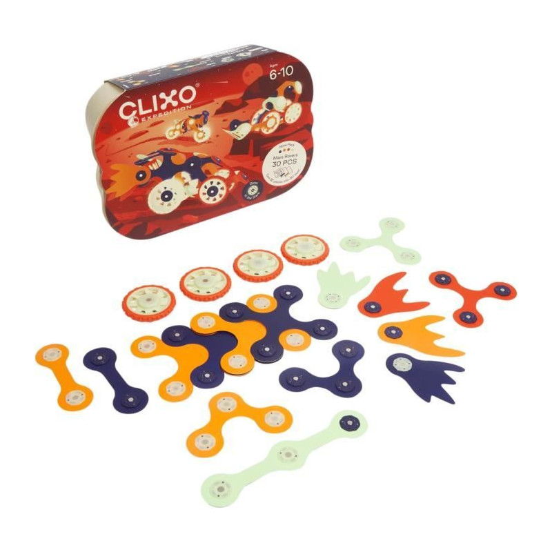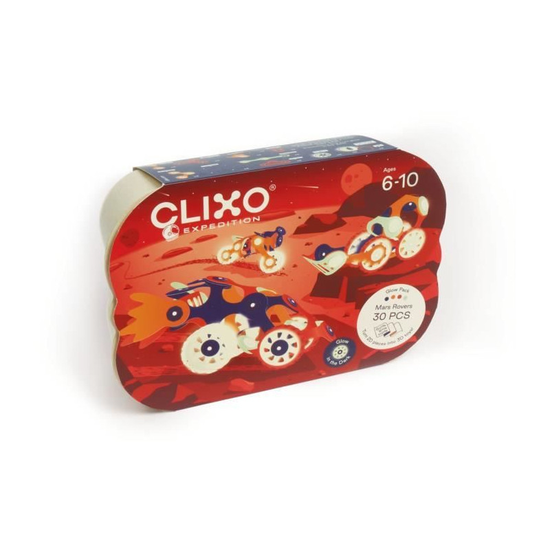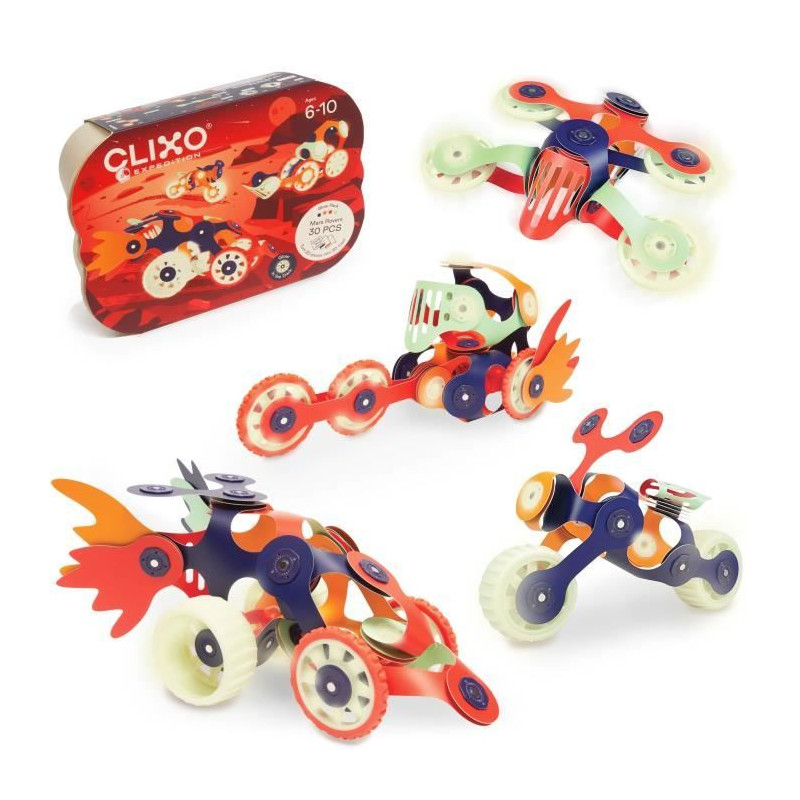 Découvrez le jeu de construction magnétique Clixo Mars Rovers avec 30 pieces qui brillent dans le noir. Idéal des 6 ans, il offre des constructions stables et créatives grâce a son magnétisme innovant. Compatible avec tous les packs Clixo, il est léger et facile a transporter. Sécurité certifiée pour une tranquillité d'esprit totale.