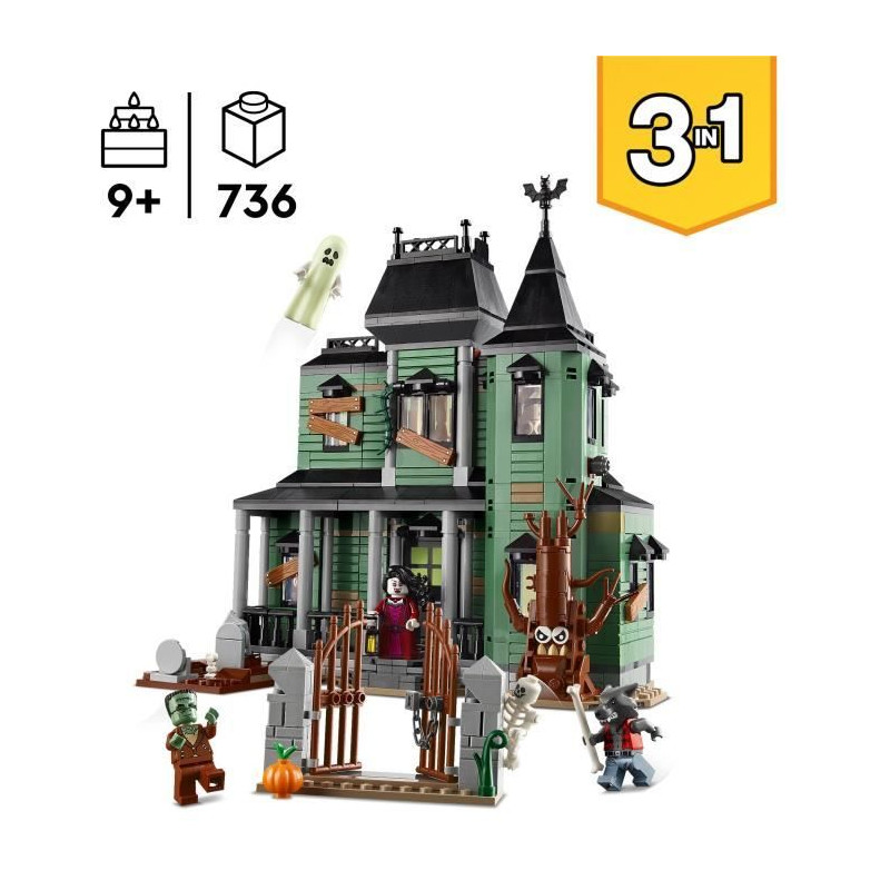 Le manoir hanté LEGO® Creator 3-en-1 permet aux enfants de construire et de transformer 3 modeles : un manoir, un train et un navire hanté. Avec 736 pieces, 5 minifigurines et de nombreuses fonctionnalités, ce jeu stimule la créativité et l'imagination des enfants des 9 ans.