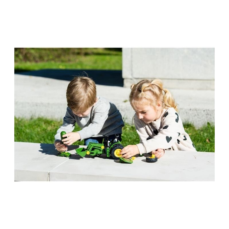 Offrez aux enfants une expérience de jeu unique avec ce tracteur John Deere 6215R qu'ils doivent assembler eux-memes. Pour cela, ils disposent d'un tournevis cruciforme et d'un plan de montage. A eux de suivre scrupuleusement les différentes étapes de construction pour donner naissance a leur tracteur : châssis, roues, siege, cabine, capot, etc. Pour etre completement opérationnel, il faut équiper le tracteur de son chargeur frontal et ne pas oublier le contrepoids d'équilibrage a l'arriere. Tracteur entierement montable et démontable. Roues souples idéales pour une utilisation en intérieur - sans faire trop de bruit - comme en extérieur. Plastique de grande qualité, tres résistant. Dimensions monté : 24,5 x 9,5 x 12 cm. A partir de 3 ans.