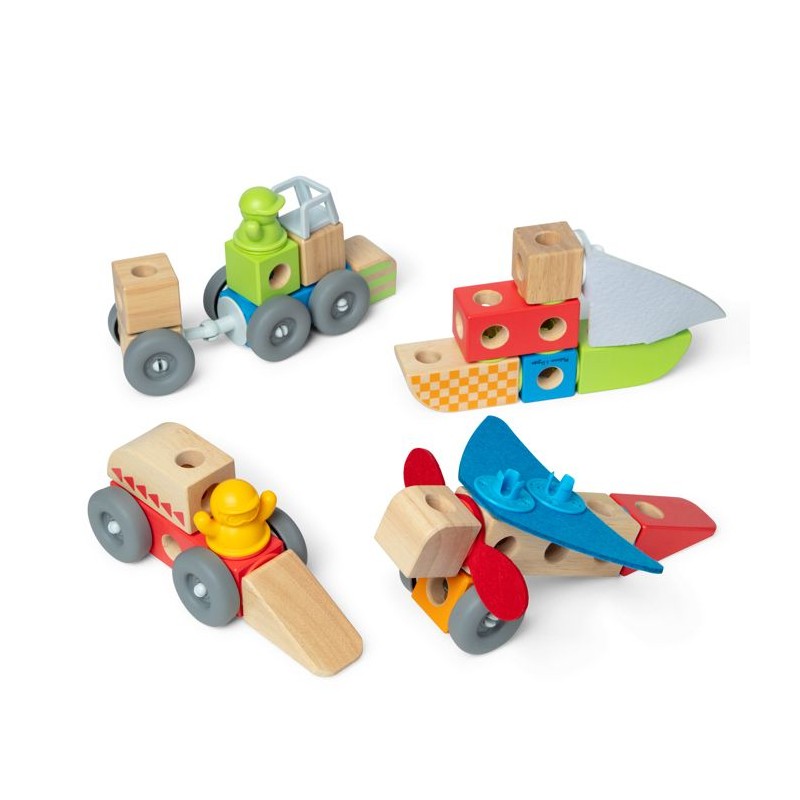 Les Véhicules - 54 pieces - Blockables Melissa & Doug Ce coffret Blockables sur le theme des véhicules invite les enfants des 2 ans a construire librement a 360°. Avec 54 pieces variées, il offre un jeu riche en possibilités pour assembler, créer et imaginer. Les blocs en bois massif FSC, les connecteurs, les accessoires et figurines en matériaux mixtes stimulent la motricité, le toucher et l'imagination. Le couvercle de la boîte sert également de plateau de jeu pour encore plus de liberté. 54 pieces pour construire des véhicules ou créer librement Blocs en bois FSC, connecteurs en plastique, accessoires et feutrine Contient deux personnages en figurines pour enrichir les scénarios Boîte de rangement transformable en plateau de jeu Compatible avec toute la gamme Blockables Melissa & Doug Des 2 ans, jeu libre ou guidé avec l'aide d'un adulte Caractéristiques du coffret Les Véhicules - Blockables Melissa & Doug Contenu : 18 blocs en bois massif certifié FSC, 17 connecteurs, 2 figurines, accessoires (dont certains en feutrine) Nombre total de pieces : 54 Poids net : 1360 g Âge recommandé : des 2 ans Compatibilité : toutes les références de la gamme Blockables Melissa & Doug Boîte fermée avec anse et fonction plateau de jeu intégrée Le coffret Les Véhicules de Melissa & Doug accompagne les plus jeunes dans leur développement avec un jeu stimulant, sensoriel et évolutif, parfaitement adapté aux petites mains curieuses des 2 ans.