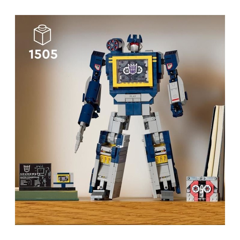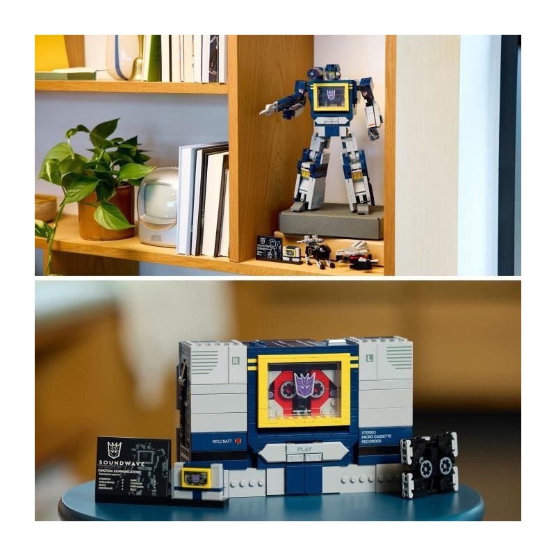 Set LEGO® Icons Transformers : Soundwave pour décorer votre intérieur ou votre bureau, avec les modeles de Soundwave, Ravage et Laserbeak.