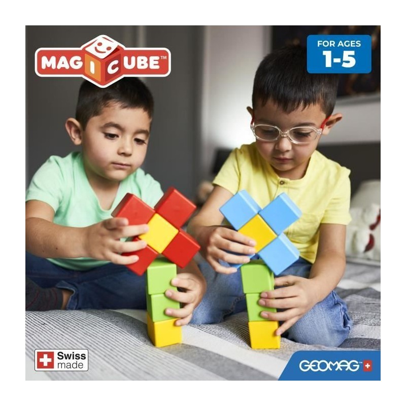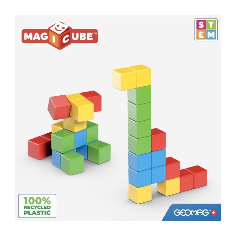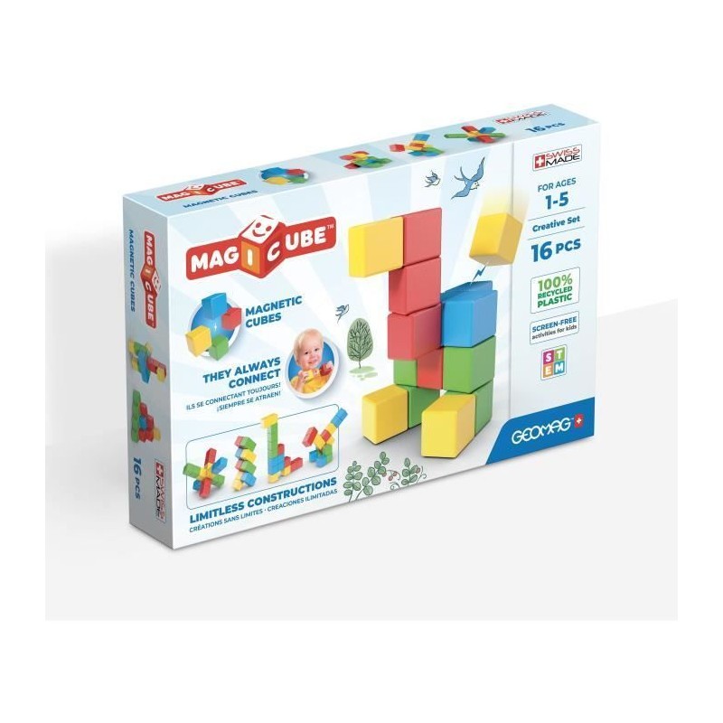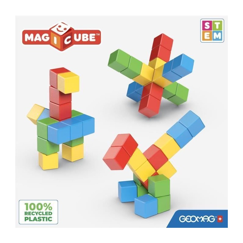 MAGICUBE est la plateforme révolutionnaire des produits Geomagworld dans la catégorie Construction Junior. Ce systeme de construction innovant est composé de cubes magnétiques qui s'assemblent sur leurs six faces. En exploitant les propriétés invisibles et magiques du magnétisme, les enfants peuvent laisser libre cours a leur imagination en construisant des modeles 3D colorés. En jouant avec quelques cubes, meme les plus jeunes commencent a développer leurs premieres compétences manuelles. La gamme recyclée Magicube, fabriquée a partir de plastique 100 % recyclé, est un jouet véritablement écologique, avec les memes couleurs vives et les memes normes de qualité élevées que tous nos produits Geomag. Laissez entrer la magie ! CIBLE POUR LES 1-5 ANS, JEU SÉCURISÉ, FABRIQUÉ EN SUISSE, CUBES ET FORMES MAGNÉTIQUES, AIMANTS ROTATIFS QUI SE CONNECTENT TOUJOURS, DÉVELOPPEMENT DES PREMIeRES COMPÉTENCES MANUELLES, STEAM/ÉDUCATIF La gamme CRÉATIVE SET offre de nouvelles possibilités d'expérimentation avec le magnétisme de Magicube et de création d'univers imaginaires infinis. Nos cubes sont fabriqués a partir de plastique 100 % recyclé, car nous Continuez a contribuer au respect de la planete. Le coffret 247 comprend 16 cubes magnétiques, de 4 couleurs différentes : vert clair, rouge, jaune et bleu clair.