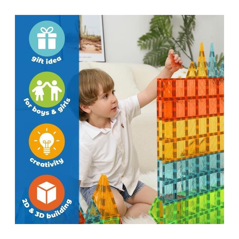 Les tiles magnétiques Geomag sont une nouvelle plateforme de jeu ludique et stimulante, composée de tuiles magnétiques aux formes géométriques variées, destinée aux enfants d'âge préscolaire. Grâce aux tiles magnétiques Geomag, les enfants peuvent laisser libre cours a leur imagination et créer des environnements et des scénarios de jeu dynamiques et évolutifs : bâtiments, maisons, fermes, châteaux et paysages naturels. Leurs jouets prennent vie et transforment la chambre de votre enfant en un espace ludique et sécurisé pour des aventures sans fin. Les tiles magnétiques Geomag présentent des textures originales en diamant, dans des teintes brillantes et translucides, telles des pierres précieuses. Ces toutes nouvelles tiles magnétiques ont été soigneusement conçues et fabriquées par Geomag, fort de décennies d'expérience et de savoir-faire technologique. Geomag, fabricant leader de constructions et de jouets magnétiques depuis plus de 25 ans, propose une fois de plus une expérience de jeu de haute qualité et sécurisée. CIBLE : 3 ANS ET PLUS, DÉVELOPPEMENT DE LA MOTRICITÉ FINE, FORMES GÉOMÉTRIQUES MAGNÉTIQUES, ÉDUCATIF, ROBUSTE ET DURABLE, QUALITÉ ET GARANTIE GEOMAG Le coffret 4211 comprend 24 tiles magnétiques combinant 5 formes : carré, triangle équilatéral, rectangle, triangle rectangle allongé et courbe d'angle. Il comprend également 2 bases de roues magnétiques ancrables pour mobiliser vos créations vous pouvez construire des véhicules simples, les attacher et les connecter, ou les assembler grâce au magnétisme des tiles pour construire un Geometric Express. Le coffret est composé d'une gamme de 7 couleurs GEMMES transparentes et brillantes.