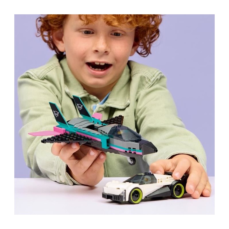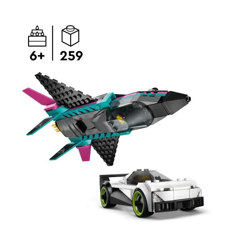 Le jet contre la voiture LEGO® City des 6 ans inclut une supercar, un jet supersonique et des minifigurines de pilotes pour des courses haletantes.