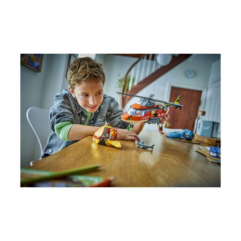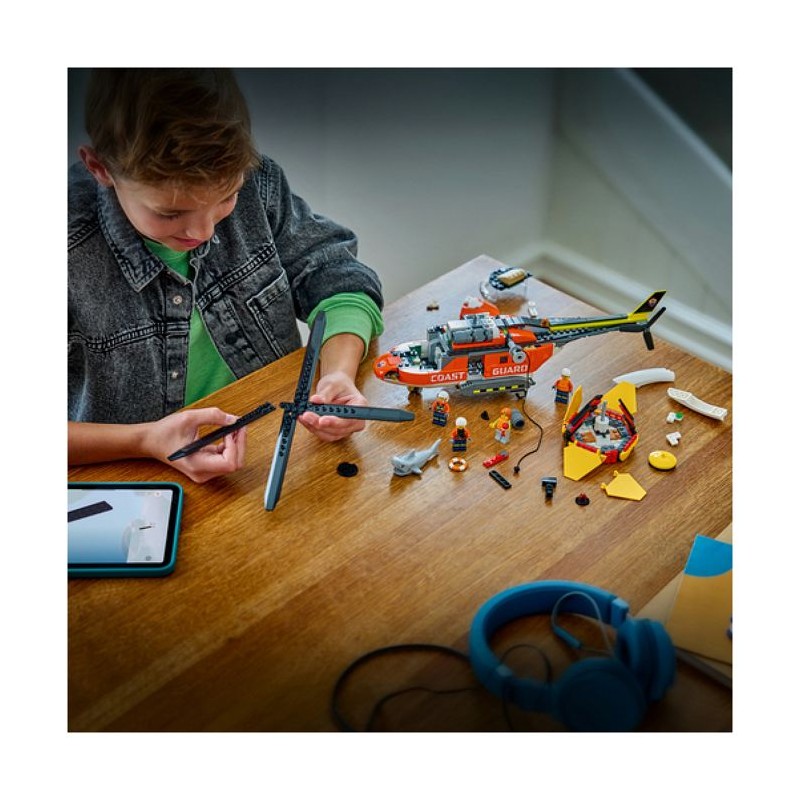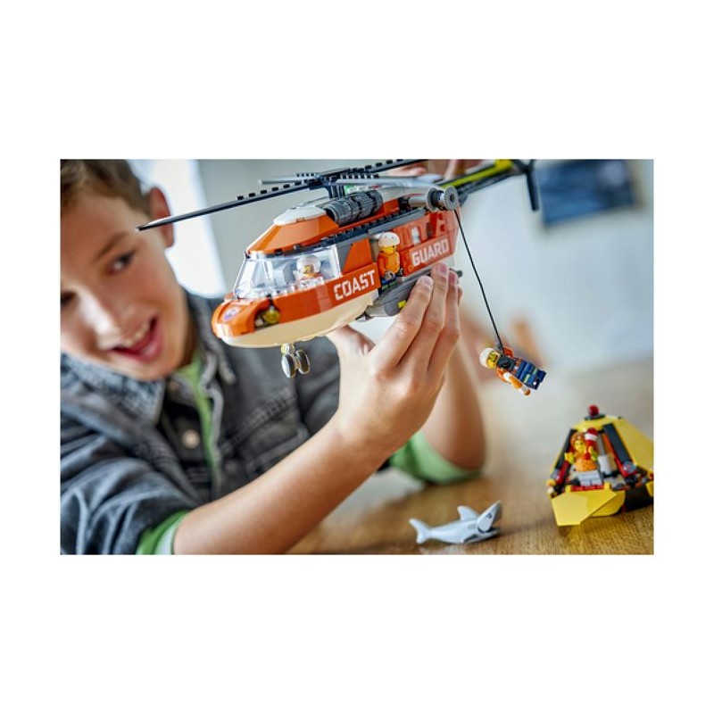 Incluant une capsule de sauvetage, 4 minifigurines et un requin, le set L'hélicoptere des garde-côtes LEGO® City inspire des missions périlleuses.