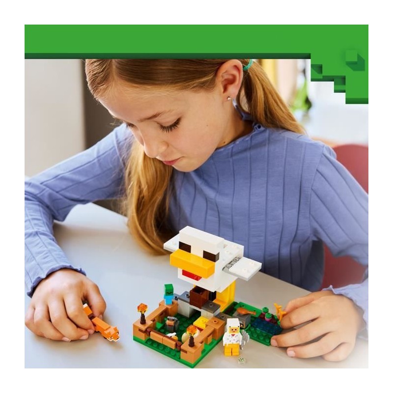 Prenez soin des poules et des légumes, et repoussez un bébé zombie avec La ferme a poulet LEGO® Minecraft® et son poulailler en forme de poulet géant.