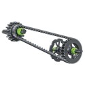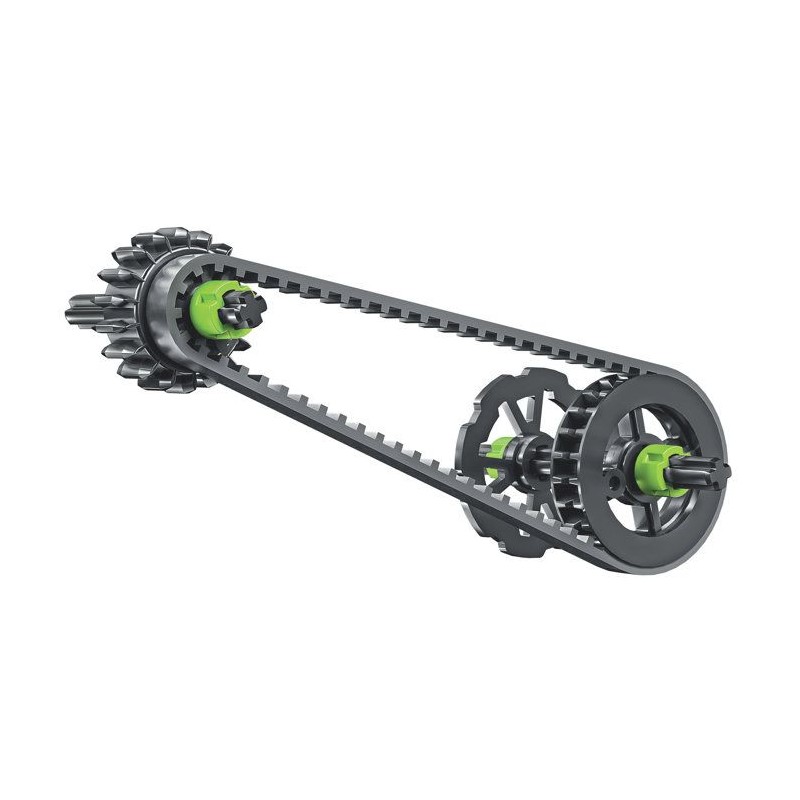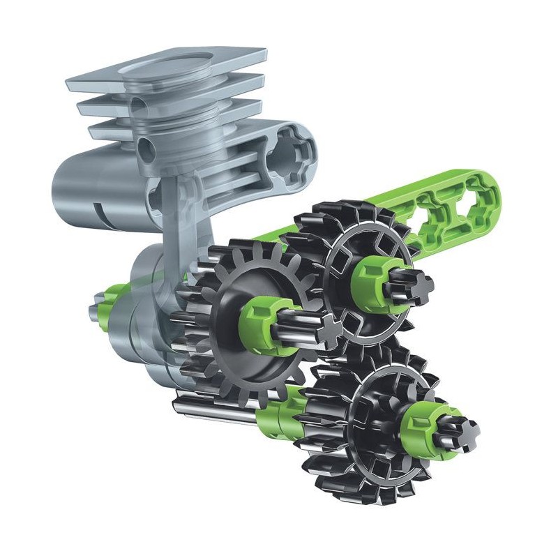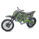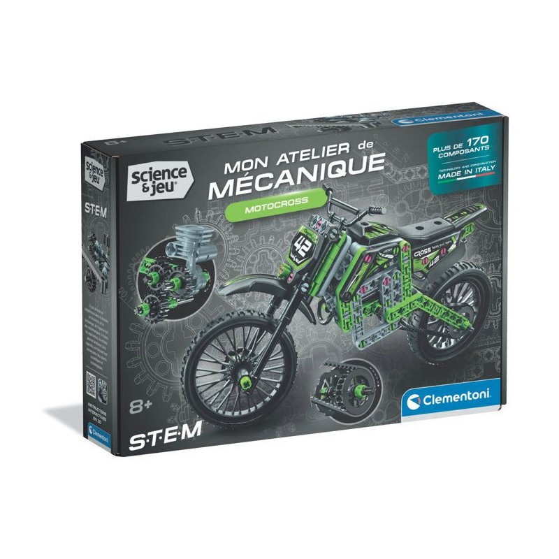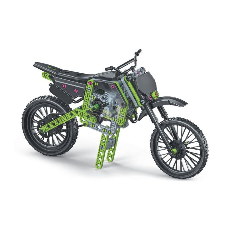 Un coffret de construction pour assembler un prototype d'un motocross. Le modele assemblé comprend des roues et des engrenages pour reproduire un systeme de direction fonctionnel.