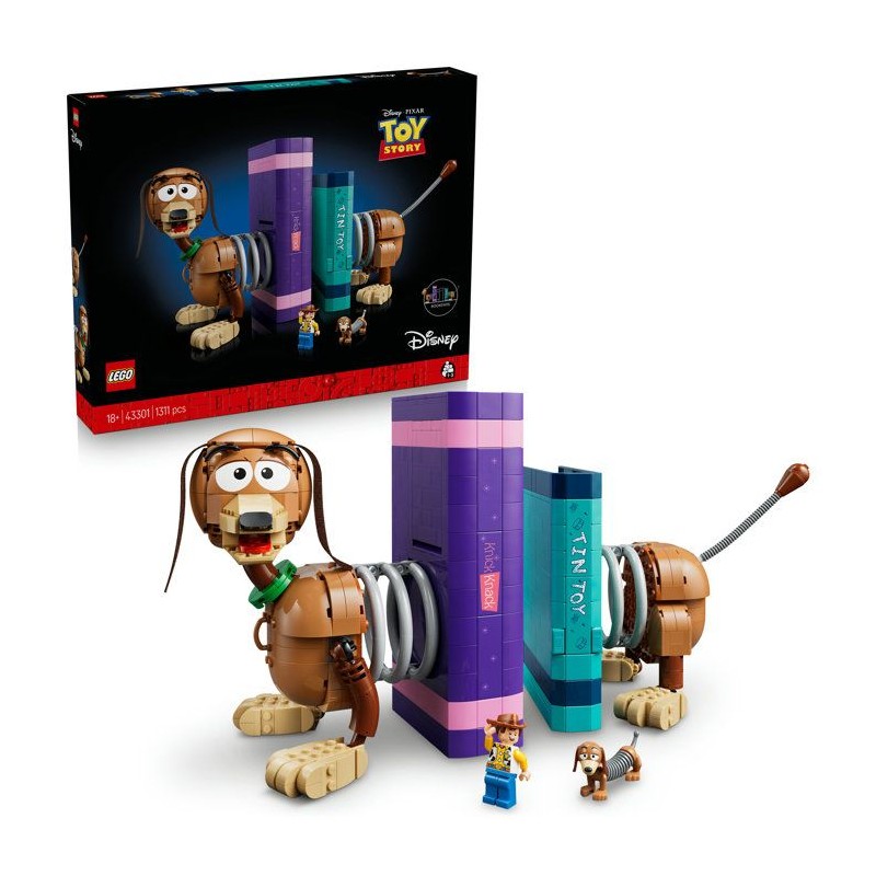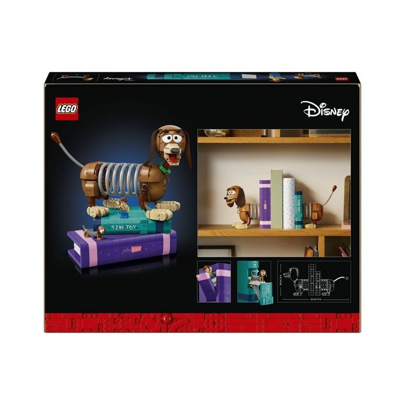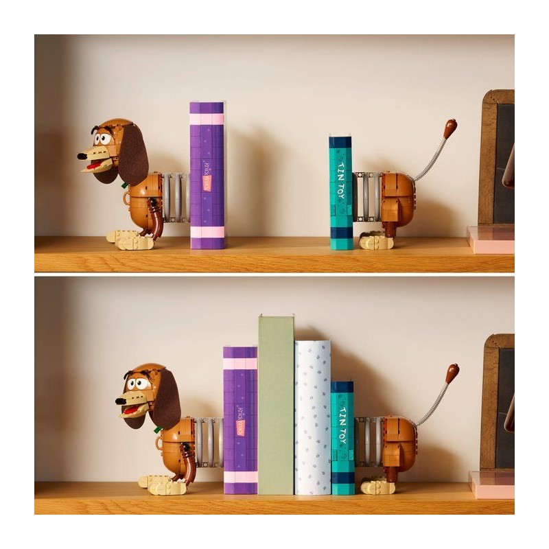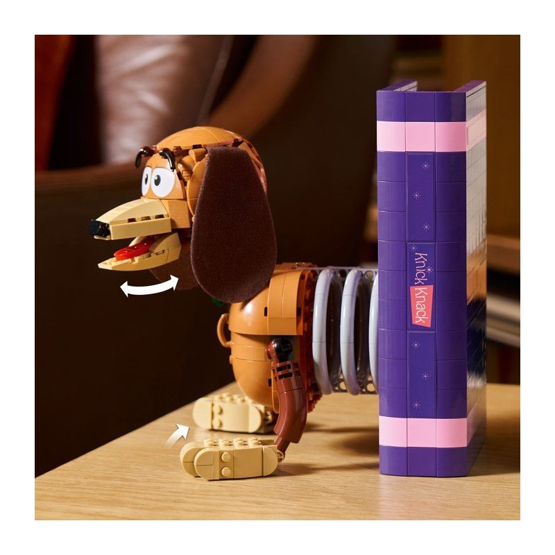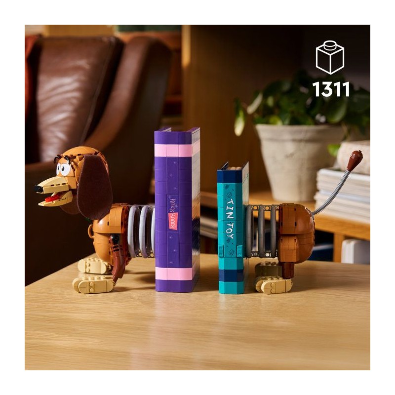 Cette décoration en forme de teckel pour adultes comprend Zigzag avec une tete qui tourne, des oreilles en tissu et des pattes articulées, ainsi que 2 livres qui se fixent au chien ou tiennent debout tout seuls. Quelques surprises sont également incluses : le petit livre renferme un personnage Zigzag LEGO | Disney et Pixar, et le grand possede un bouton faisant apparaître une minifigurine de Woody