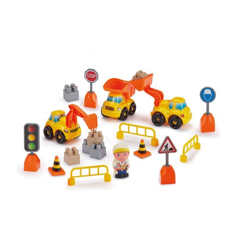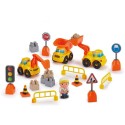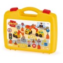 Malette de rangement comprenant 3 véhicules de chantier, 1 personnage, 3 panneaux de signalisation et plusieurs accessoires.