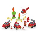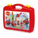 Malette de rangement comprenant 3 véhicules pompier, 1 hélicoptere, 1 personnage et plusieurs accessoires.