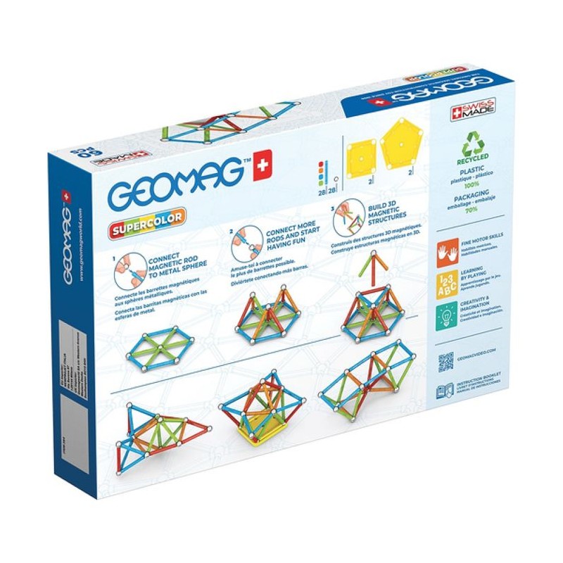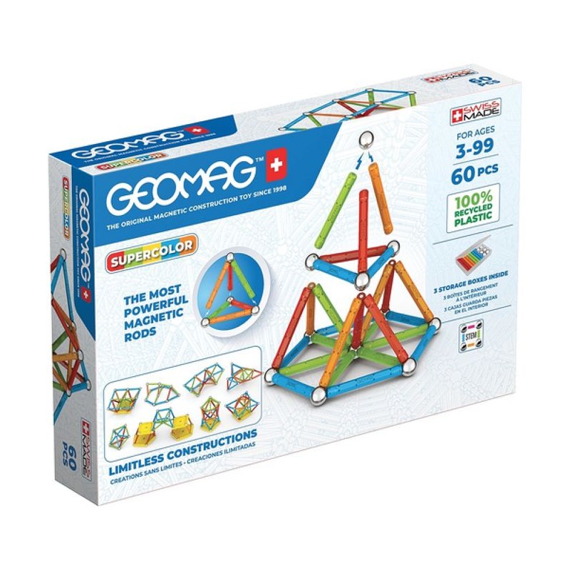 La plateforme GEOMAG vous permet de construire une infinité de structures 3D, grâce aux forces magiques du magnétisme, libérant ainsi la créativité et l'imagination pendant que vous jouez. Les tiges magnétiques, les spheres en acier et les panneaux de différentes formes forment le systeme de construction magnétique qui a rendu la marque célebre dans le monde entier. Geomag propose plusieurs gammes de produits : Classic, Classic Panels, Supercolor, Glitter, Glow et E-Motion. Toutes ces lignes vous permettent de créer des structures plus grandes, meilleures et plus stables. Geomag est produit a partir de plastique 100 % recyclé et est désormais un jouet véritablement respectueux de l'environnement, avec les memes couleurs vives et les memes normes de qualité élevées que tous nos ensembles Geomag originaux. Les boîtes en carton contiennent également un pourcentage élevé de matériaux recyclés. Vous pouvez désormais avoir vos cannes et spheres Geomag avec vous a tout moment et tout garder propre apres avoir joué. Les nouvelles boîtes produites avec du plastique 100% recyclé sont disponibles dans tous les nouveaux sets de la ligne Classic Recycled. Ils sont transparents pour que vous puissiez voir les couleurs, au format de poche et robustes pour que vous puissiez les avoir avec vous a tout moment ! La ligne SUPERCOLOR 100% Recyclée est dédiée a tous ceux qui veulent jouer avec une explosion de couleurs. Le plastique recyclé écologique Geomag utilisé pour les tiges, les panneaux et les bases se marie si bien avec cette palette de couleurs, ravissant meme les esprits créatifs les plus exigeants. Le coffret de jeu 384 comprend 28 tiges magnétiques de 4 couleurs différentes, 28 spheres métalliques, 2 plateformes carrées, 2 plateformes pentagonales. 3 boîtes Geomag sont incluses.