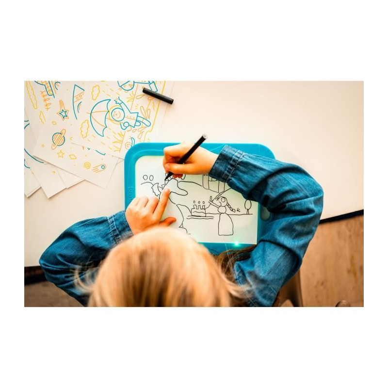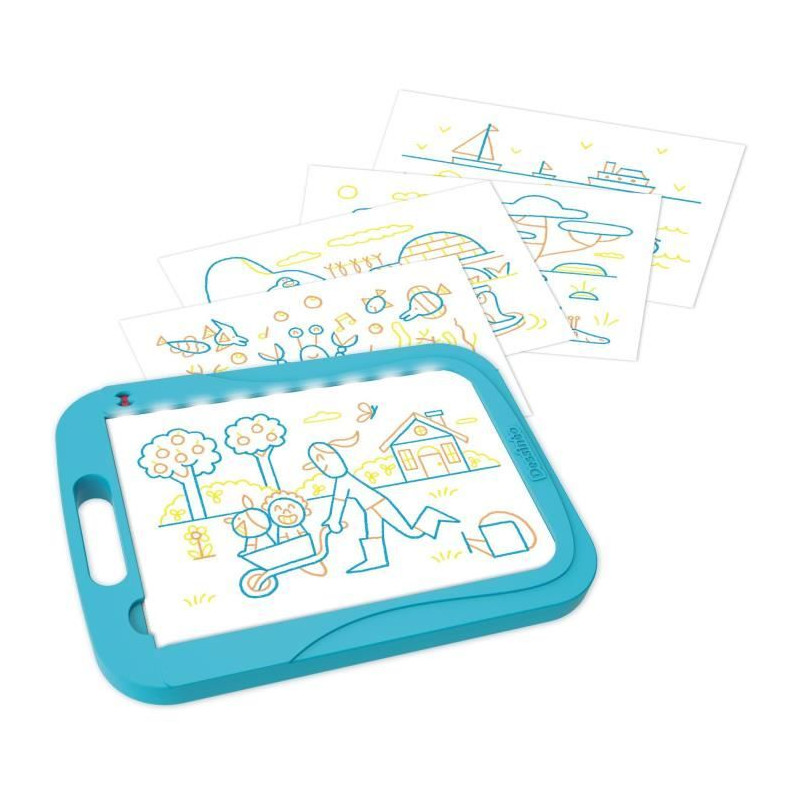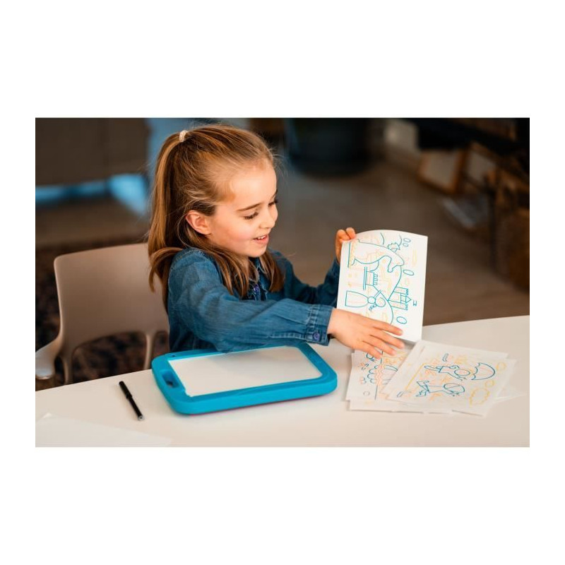 La tablette a dessin DESSINEO de NATHAN permet aux enfants des 4 ans d'apprendre a dessiner de maniere ludique. Grâce a un modele a suivre et un pupitre lumineux, ils créent facilement des oeuvres. Pratique et nomade, elle se transporte aisément et dispose d'un rangement pour les planches.