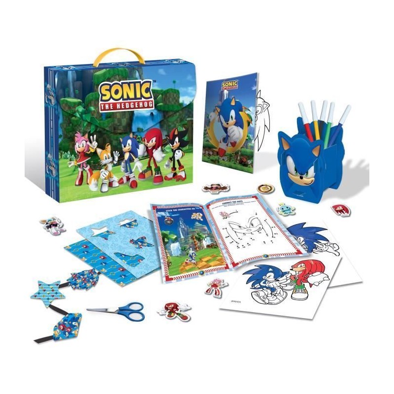KIT DE BUREAU CRÉATIF SONIC, Contenu dans la magnifique mallette de Sonic, un fantastique kit de bureau pour avoir tout ce dont tu as besoin avec toi ! a l'intérieur, tu trouveras tout ce dont tu as besoin pour colorier et dessiner tes personnages préférés, un magnifique porte-stylo a construire et de fantastiques autocollants pour personnaliser tes créations.. A partir de 3 ans- Fabriqué en Italie