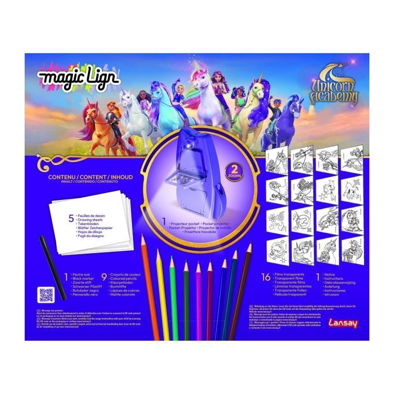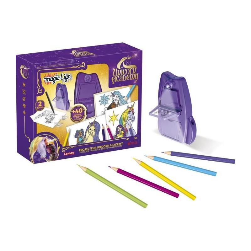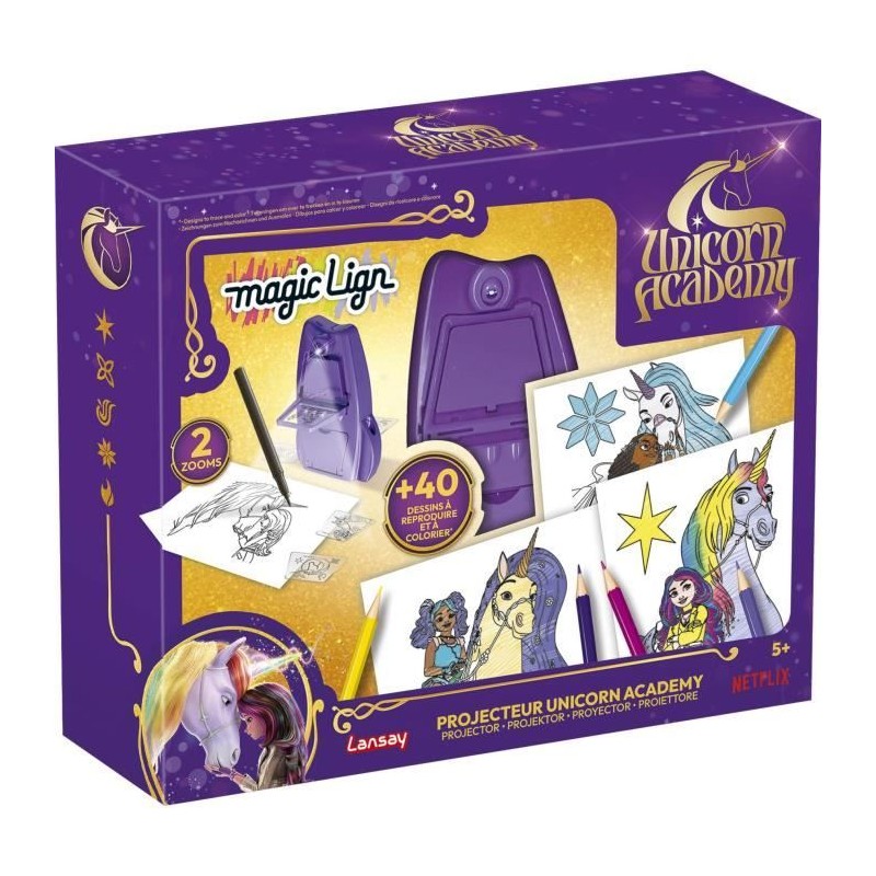 Avec Magic Lign Unicorn Academy. amuses-toi a recréer tes licornes et personnages préférés de l'école des Licornes ! Reproduis facilement l'image de ton choix avec plus de 50 illustrations a dessiner et a associer : tes licornes et personnages favoris. leurs accessoires. et bien d'autres encore issus de cet univers magique ! Grâce a son format compact. emmene-le partout avec toi ! Tu peux meme ranger les illustrations dans un compartiment intégré au projecteur.