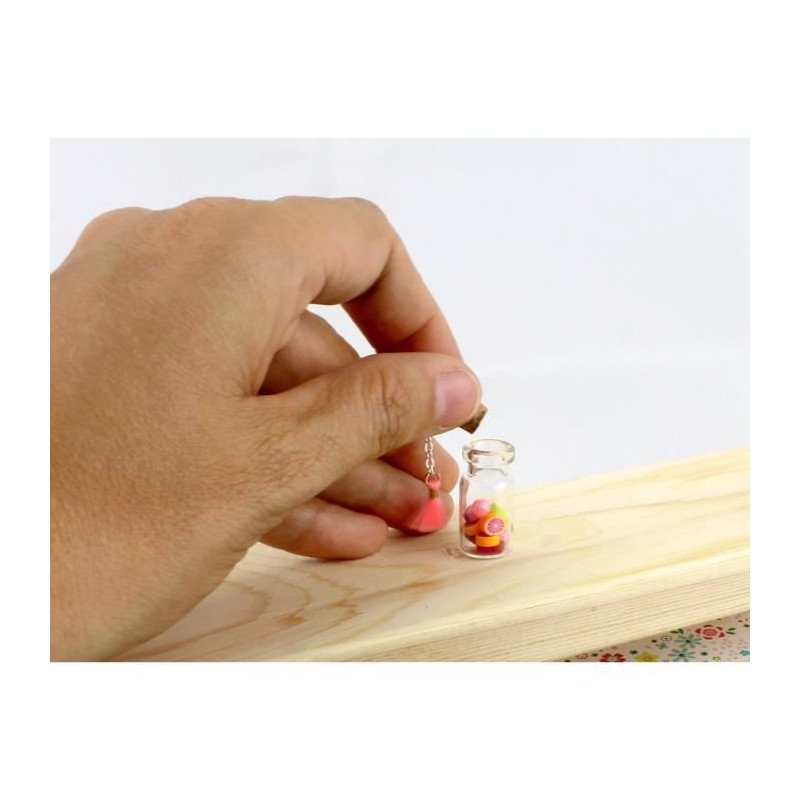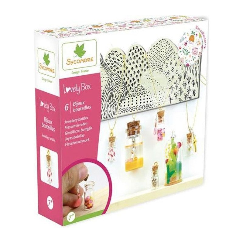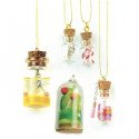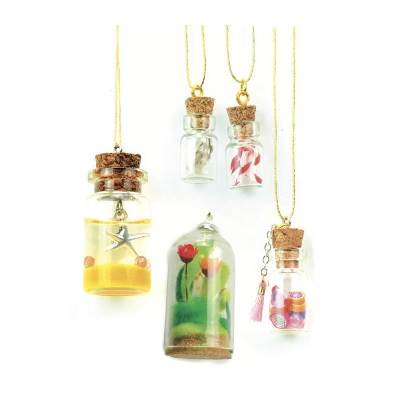 Crée de jolis bijoux bouteilles, pour cela tu découvriras plusieurs techniques différentes pour confectionner de mini décorations et accessoires. 6 projets a réaliser. Ce kit contient: 6 bouteilles avec bouchon en liege de tailles différentes, 2 pains de pâte qui durcit a l'air, 1 plume, 2 breloques, 1 mini pompom, 1 coquillage, 6 crochets, 1 fils doré, 1 tube de sable, 2 pieces de feutrine, 2 épingles, 3 sticks de p