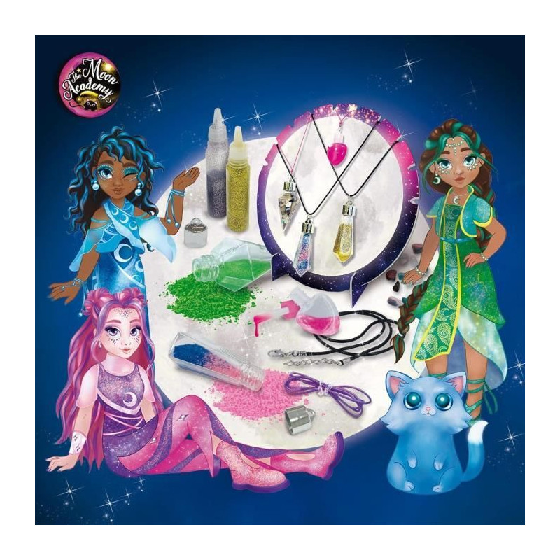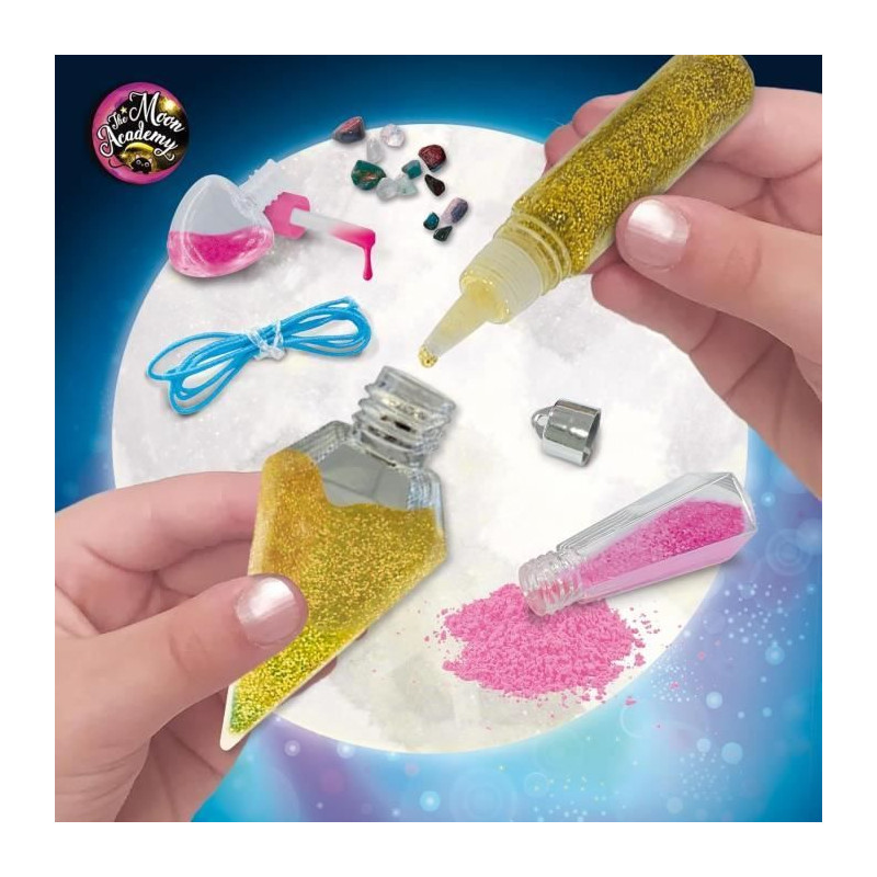 Découvrez le kit créatif 'Cristaux Magiques' de THE MOON ACADEMY. Créez de magnifiques pendentifs en forme de cristaux, décorés avec des paillettes, du sable coloré et des pierres précieuses. Idéal pour les enfants a partir de 7 ans, fabriqué en Italie.