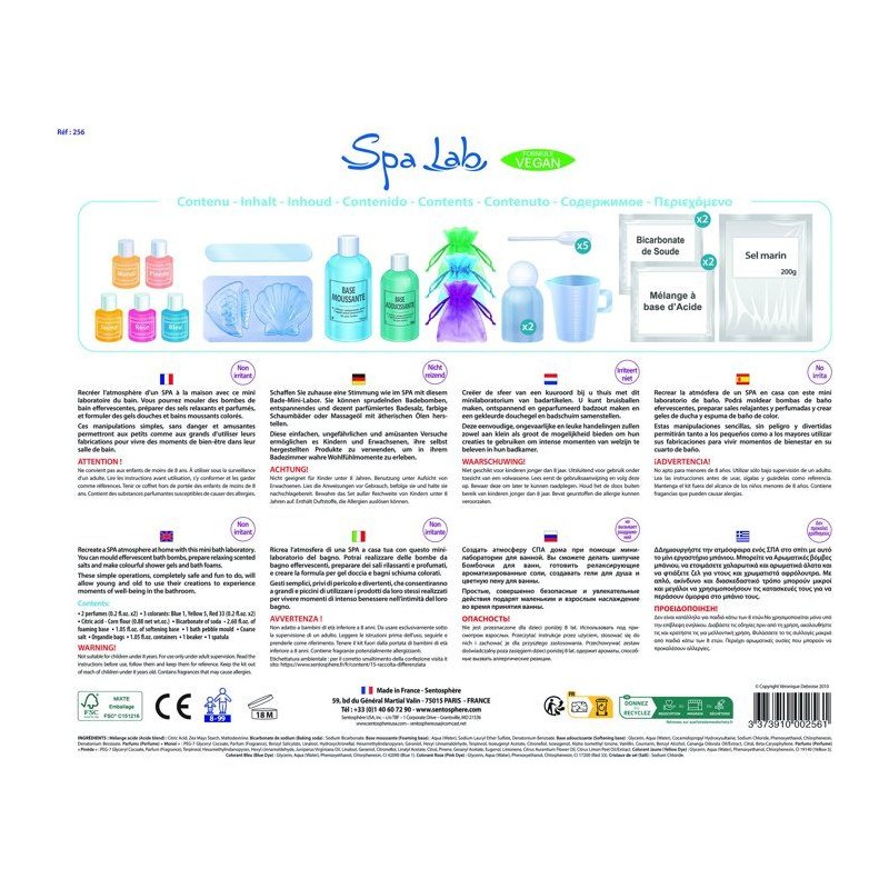 Créer les cosmétiques nécessaires pour obtenir une ambiance Spa chez soi, est possible avec ce coffret de DIY. Les ingrédients végan de ce mini laboratoire ont été repensé pour offrir plus de bonheur aux enfants ou aux adultes lors de l'expérimentation mais aussi lors de l'utilisation des bains moussants, des bombes de bain ou encore des sels de bain aux couleurs et parfums relaxants. Toutes les manipulations sont simples, sans danger et amusantes, pour vivre des moments de partage entre toutes générations.