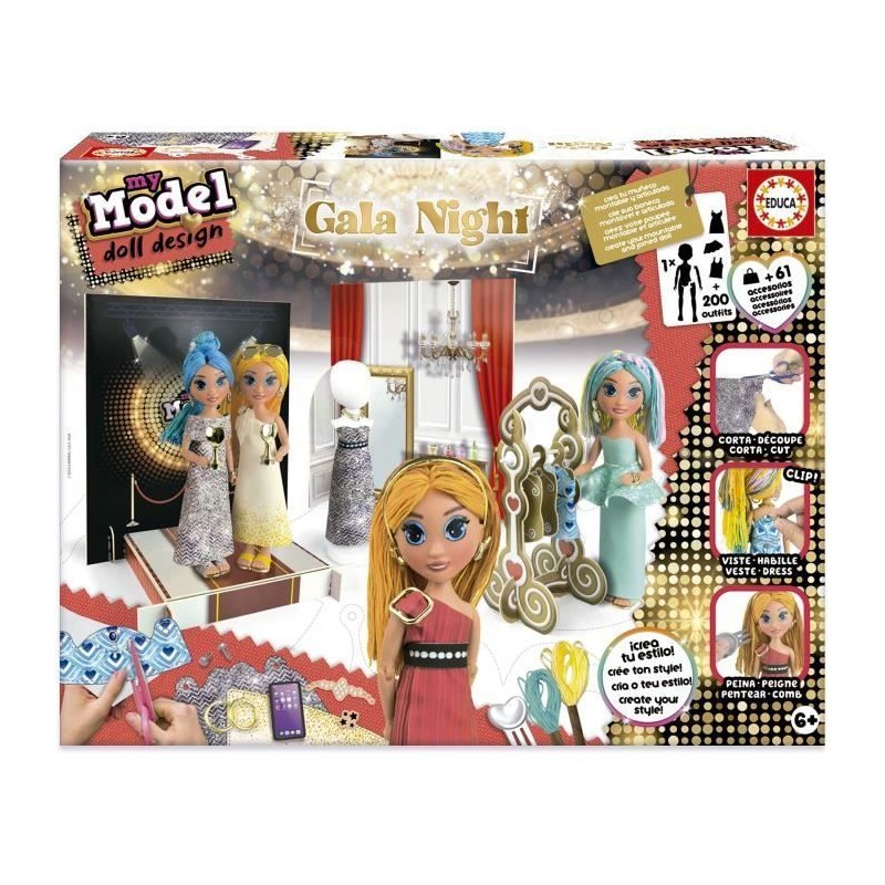 Deviens styliste avec le kit de création de mode EDUCA Gala Night ! Crée plus de 200 tenues pour ta poupée grâce aux tissus imprimés et personnalisables. Inclus : mannequin, photocall et porte-manteau. Idéal pour stimuler la créativité des enfants des 6 ans.