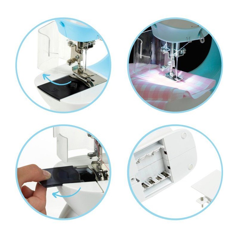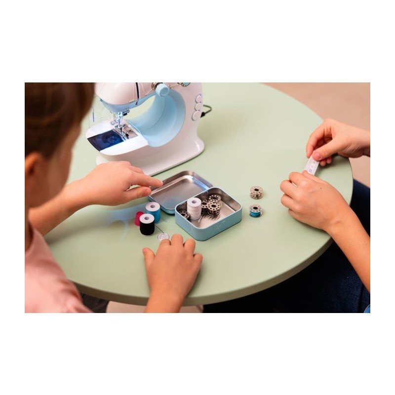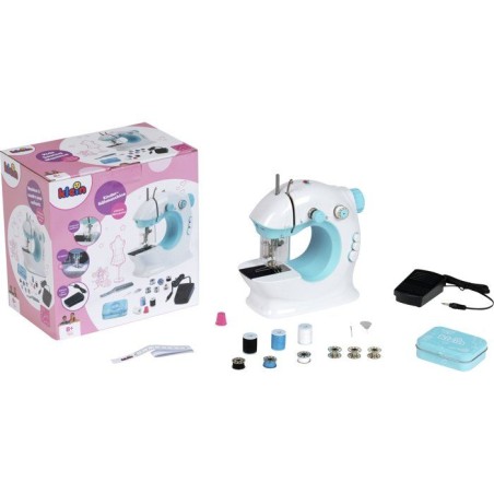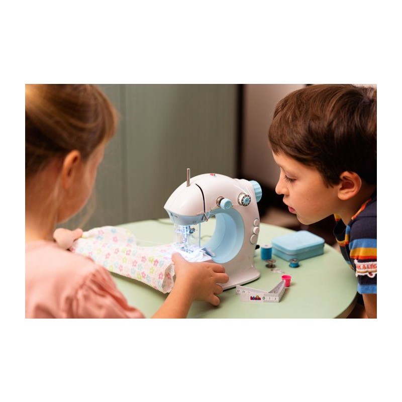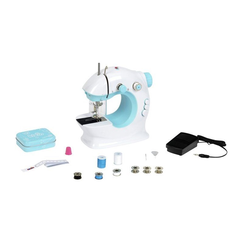 Coudre devient un jeu d'enfant avec cette machine ! Avec ses 2 vitesses et son fil supérieur et inférieur, elle coud vraiment et les nombreux accessoires permettent de créer toutes les envies : dés a coudre, fils de couleurs, metre ruban, tire fil, aiguille a coudre de rechange. Elle est équipée comme une vraie avec éclairage, tendeur de fil, canette, porte bobine rétractable,... Elle est bien sûr sécurisée grâce a un dispositif de sécurité transparent qui empeche les doigts des enfants de toucher l'aiguille lors de la couture. Le travail peut etre fait grâce a la pédale (a piles) ou en version manuelle a l'aide du volant pour une couture plus lente et précise. Stimule la créativité et l'habileté manuelle des enfants. Convient aux enfants a partir de 8 ans. Dimensions de la machine a coudre : 21 x 10 x 22,5 cm. Piles non fournies : 4 x R6-AA .